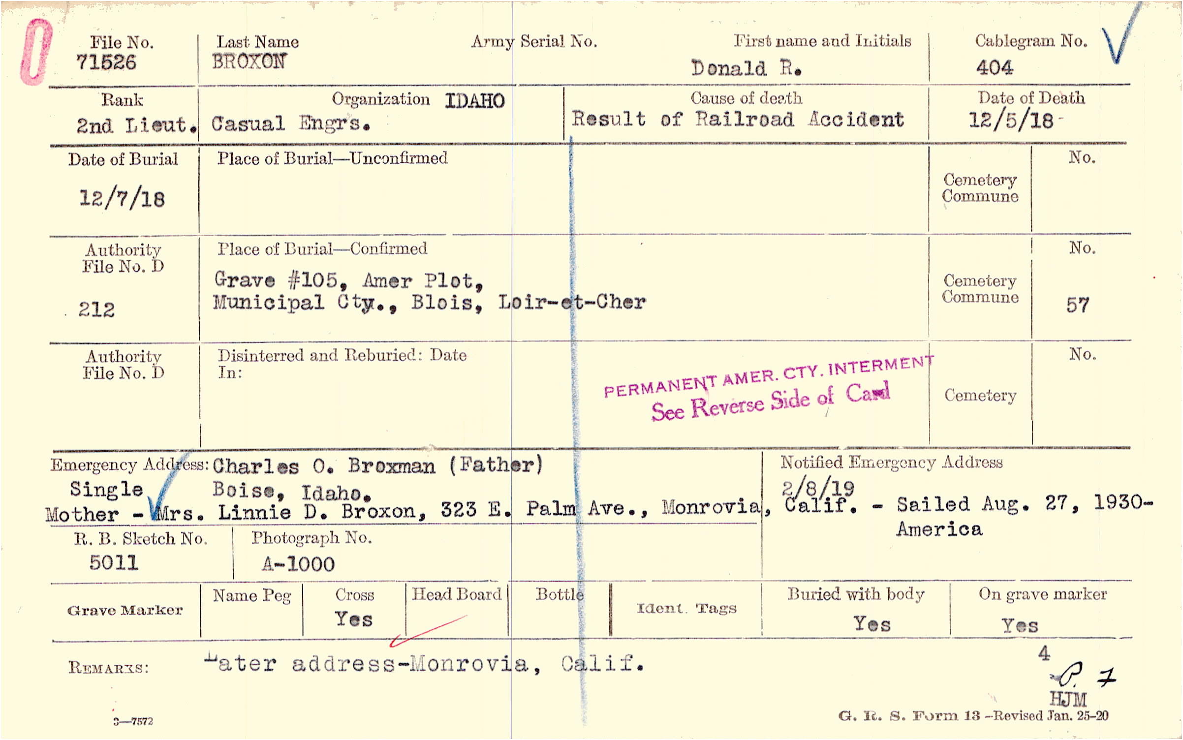 Charles O. Broxman (Father), Boise, Idaho., Single Mother - Mrs. Linnie D. Broxon, 323 E. Palm Ave., Monrovia, Calif. - Sailed Aug. 27, 1930- America