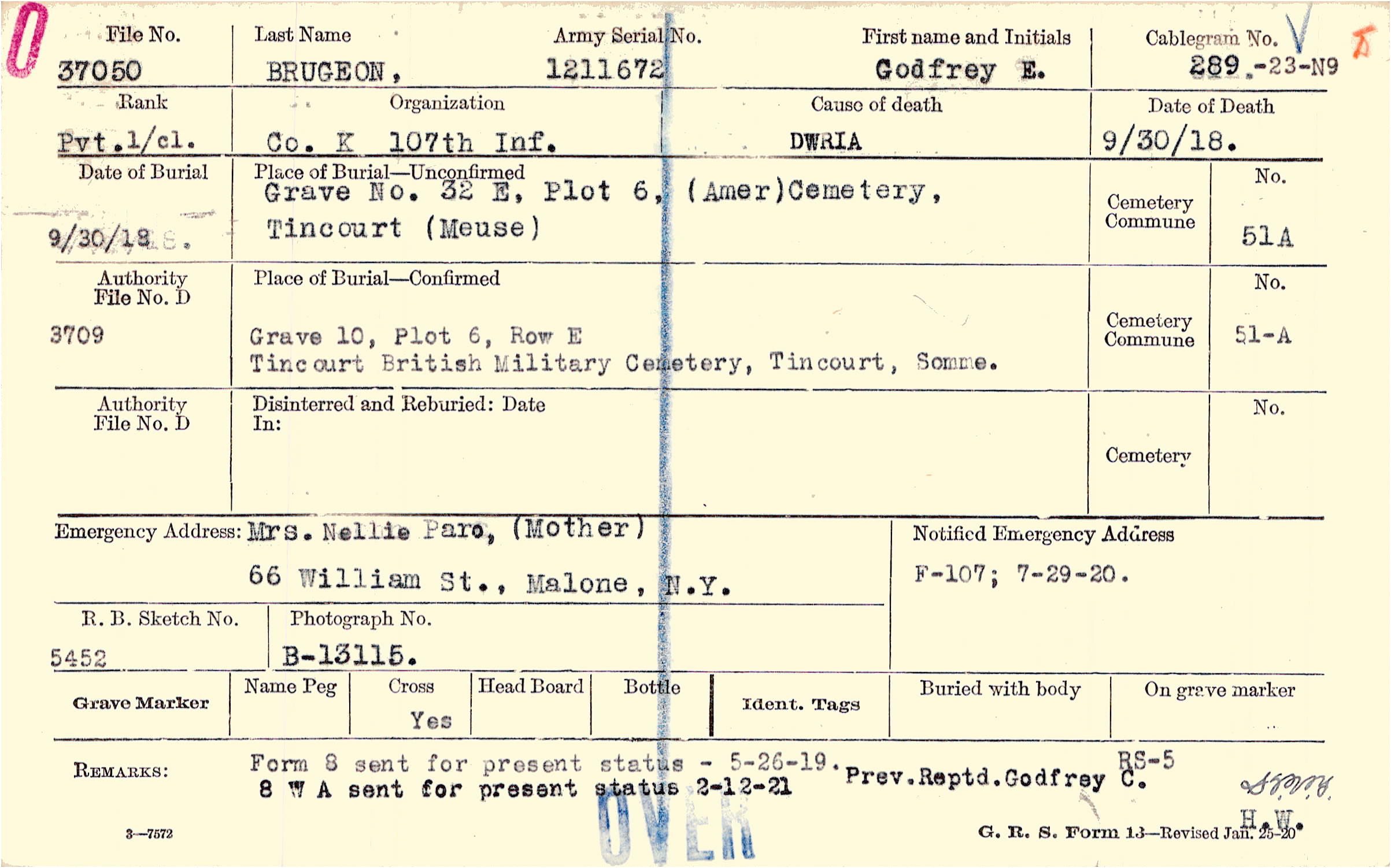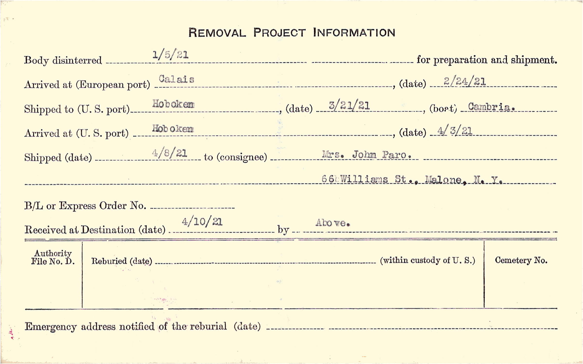 Mrs. Nellie Paro, (Mother), 66 William St., Malone, N.Y.