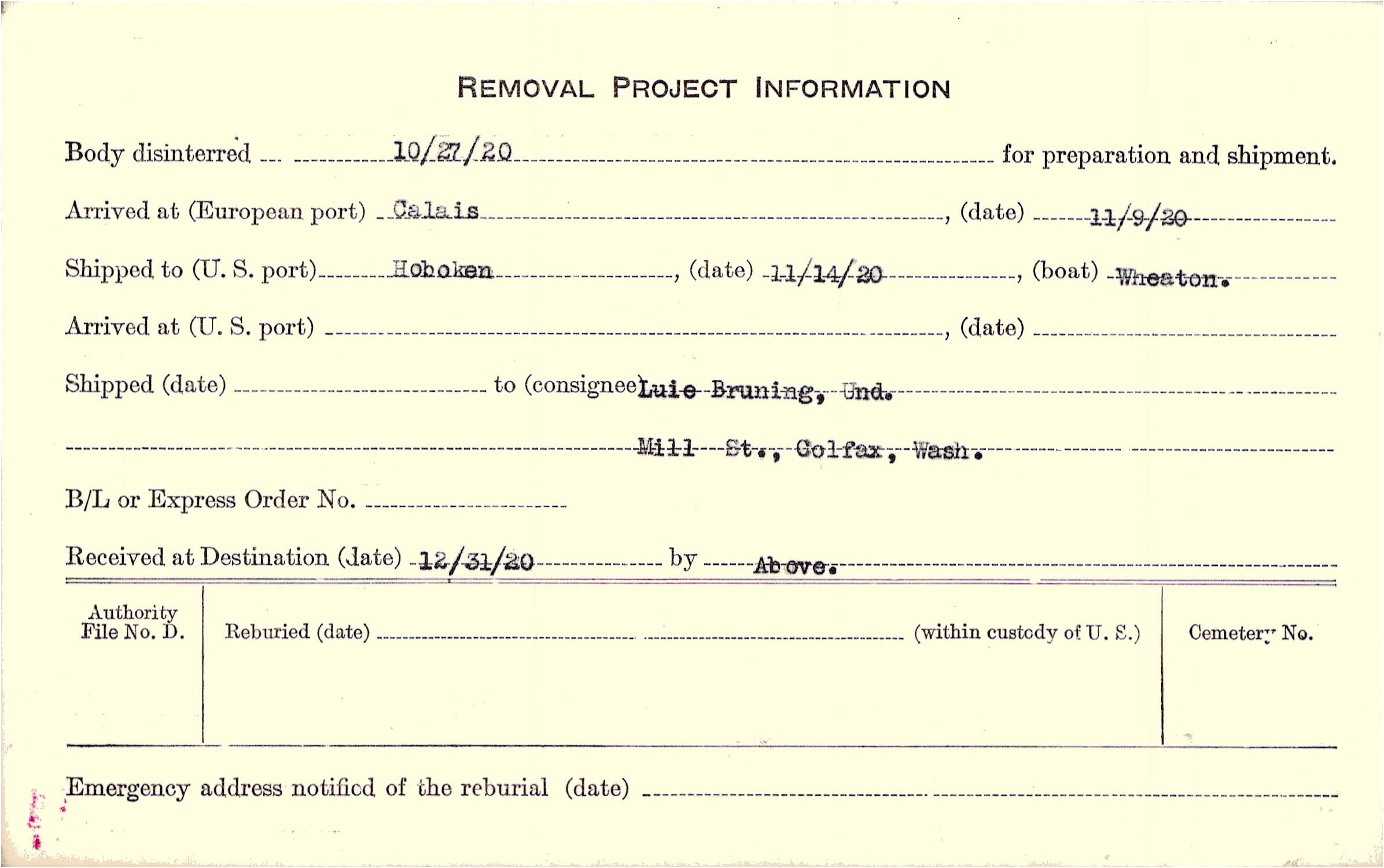 to Luie Bruning, Und., Mill St., Colfax, Wash.