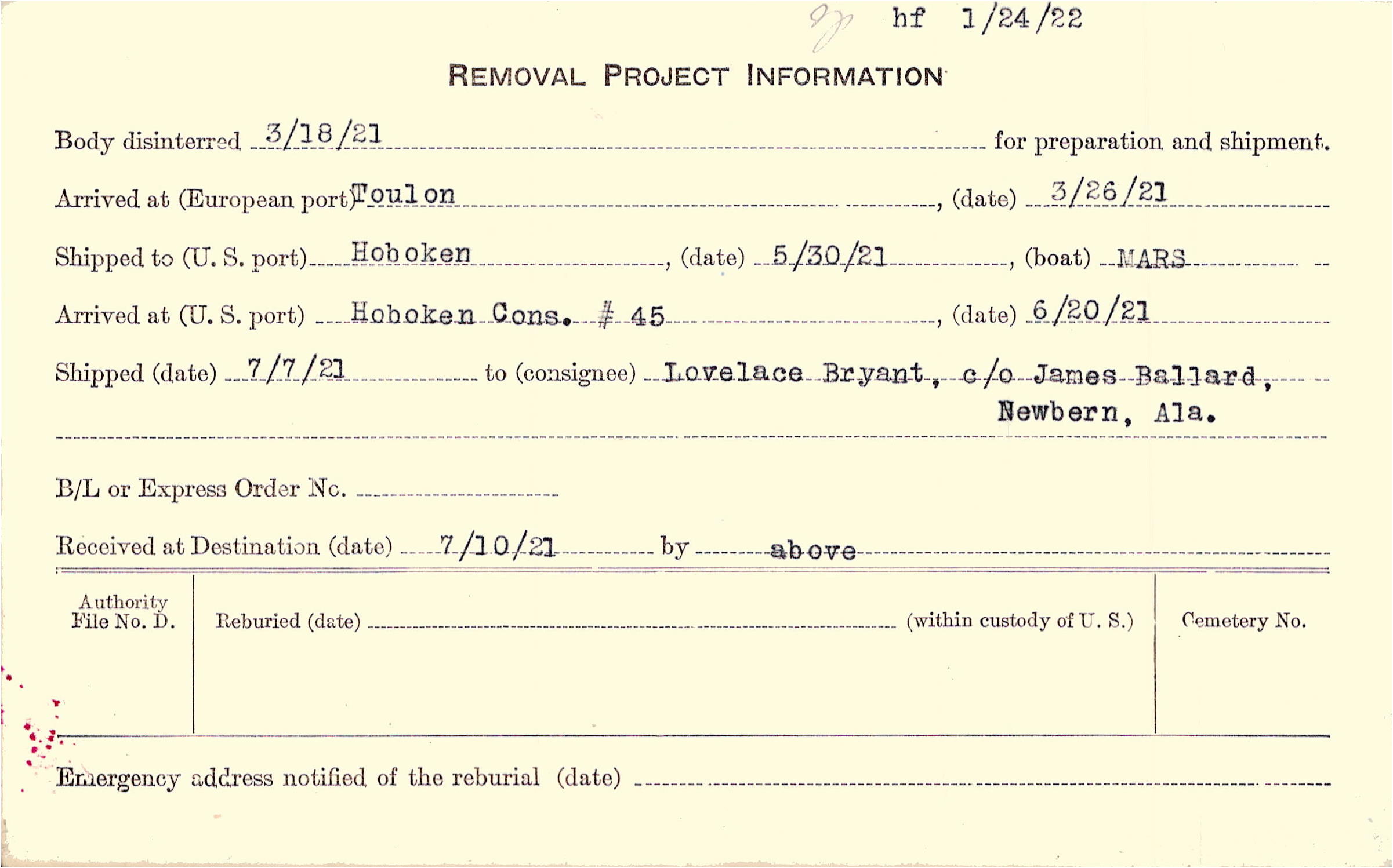 Body disinterred 3/18/1921 for preparation and shipment.