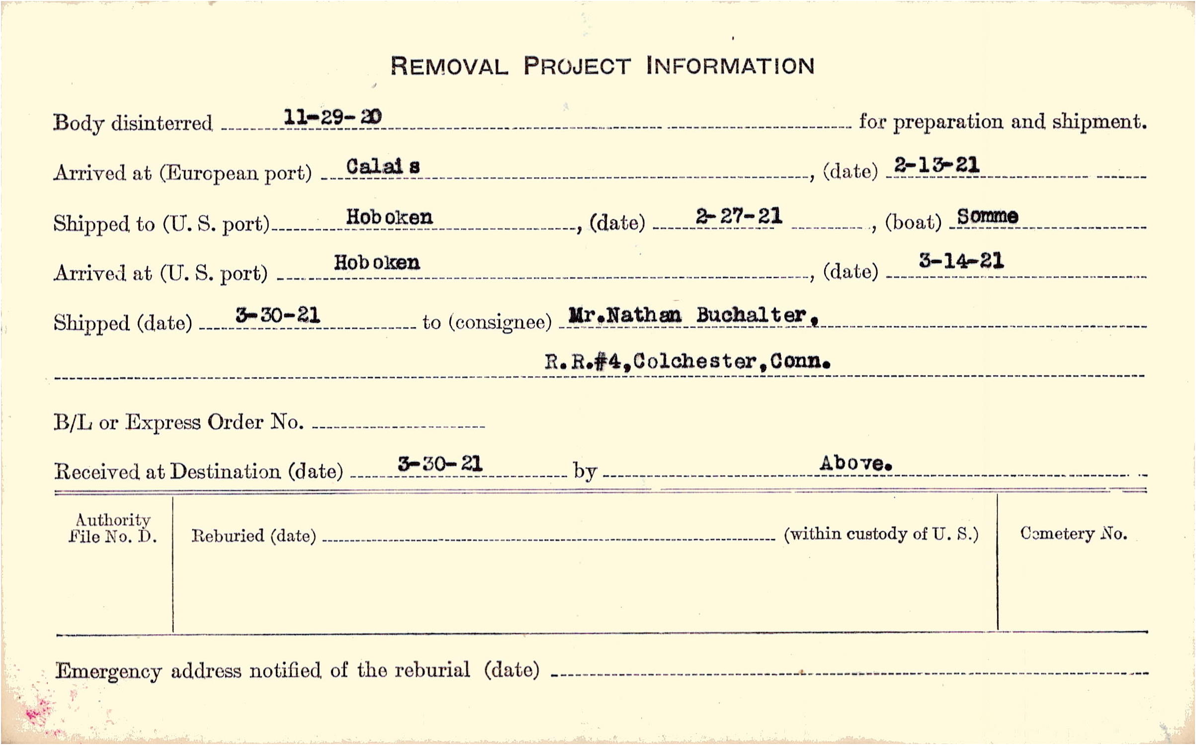 Body disinterred 11/29/1920 for preparation and shipment.