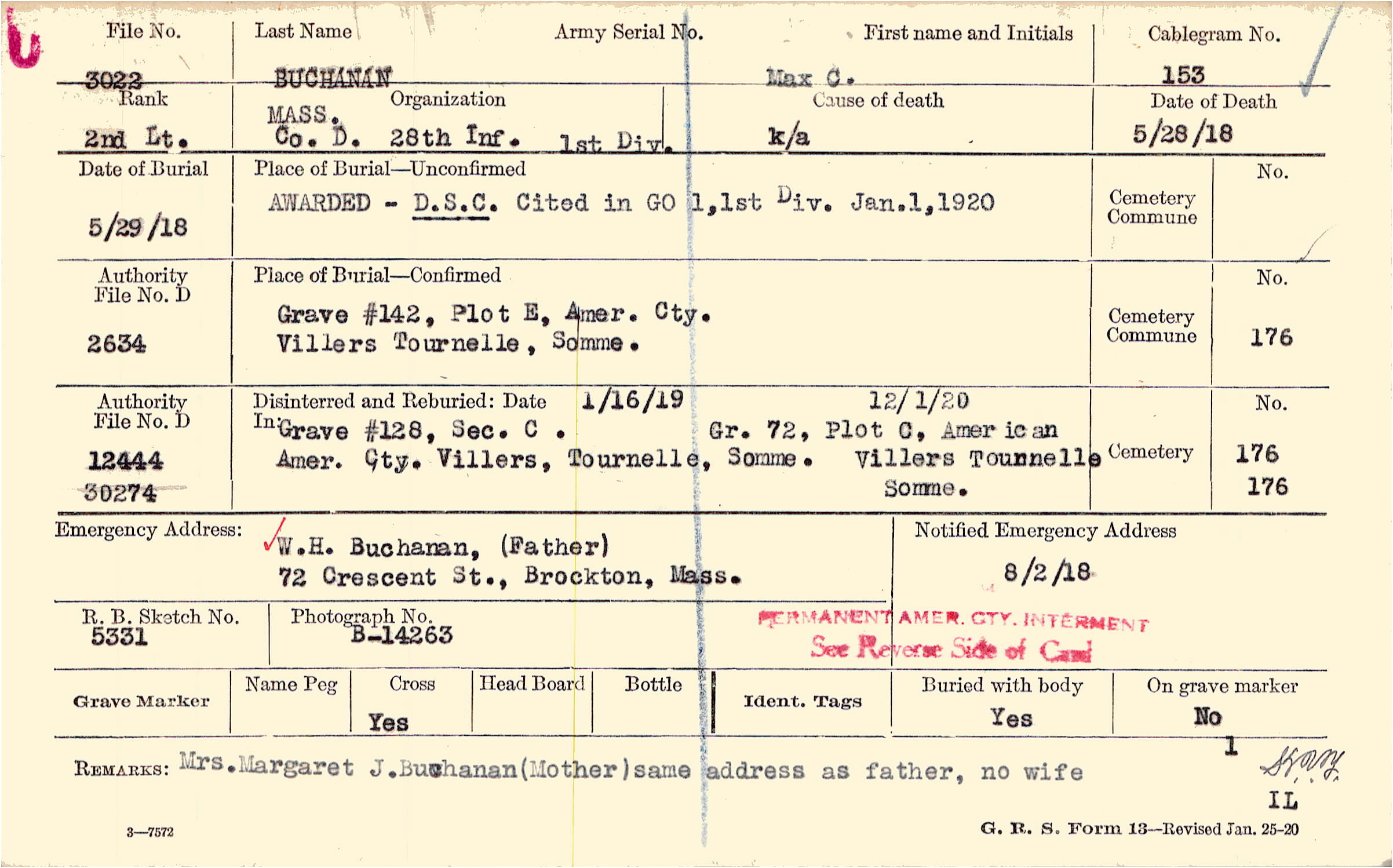 W.H. Buchanan, (Father), 72 Crescent St., Brockton, Mass.