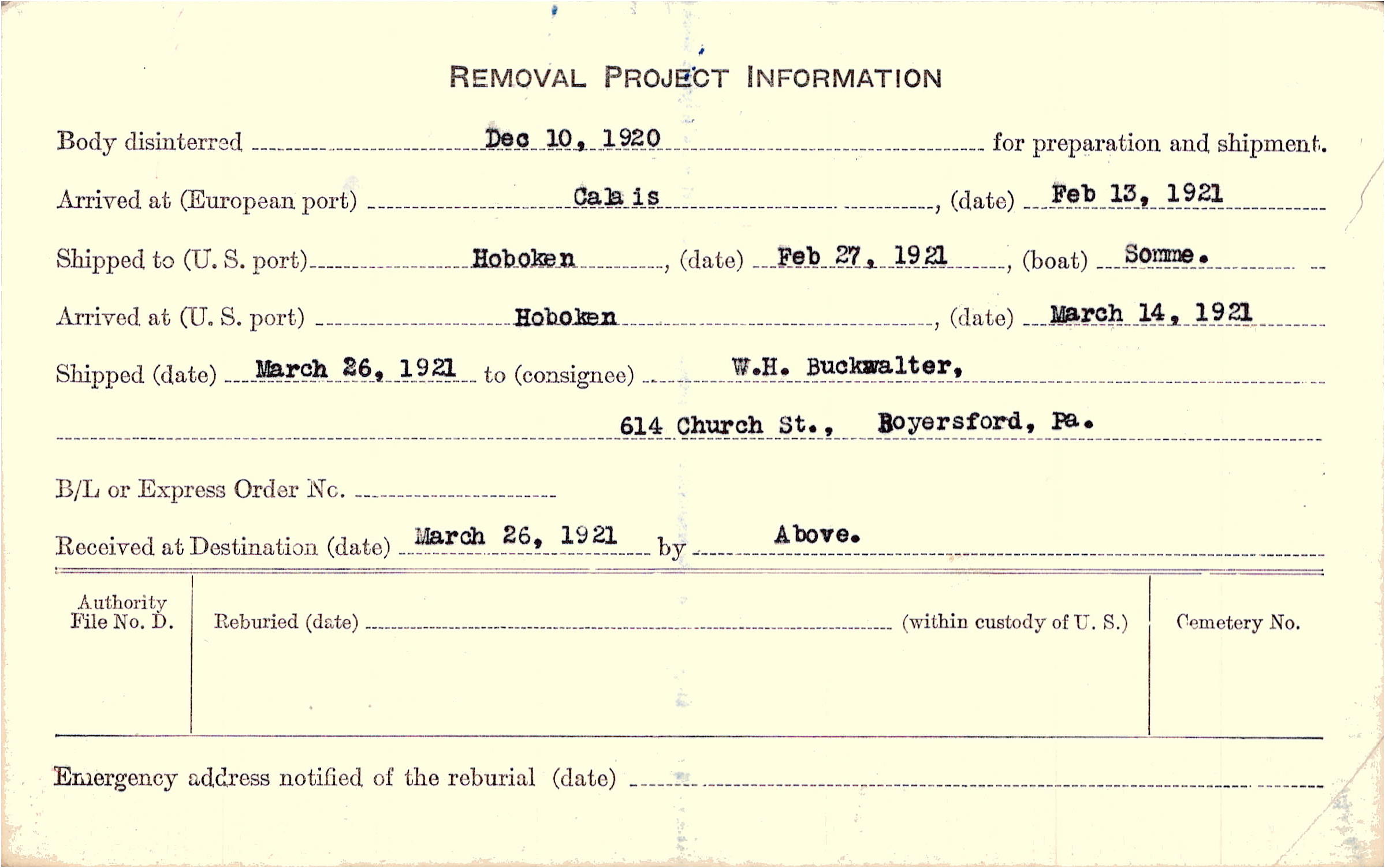 to W. H. Buckwalter, 614 Church St., Boyersford, Pa.