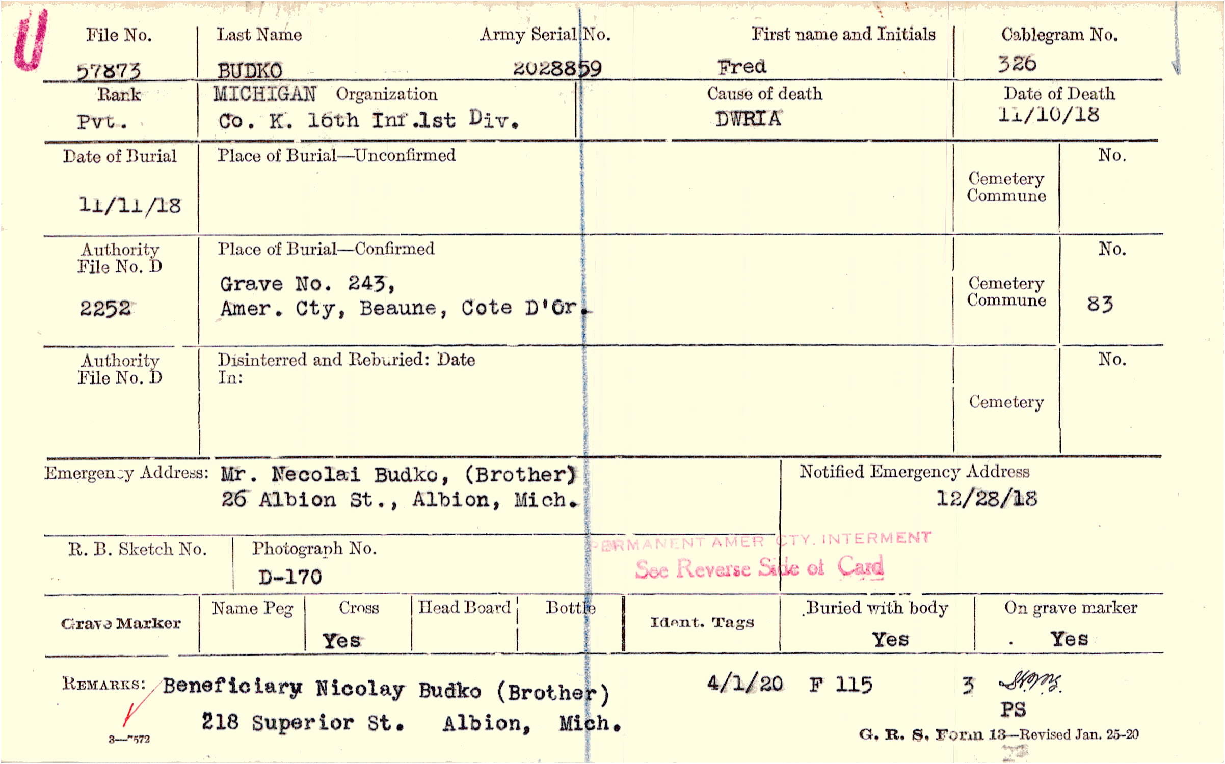 Beneficiary Nicolay Budko (Brother) 218 Superior St. Albion, Mich., 4/1/20 F 115
