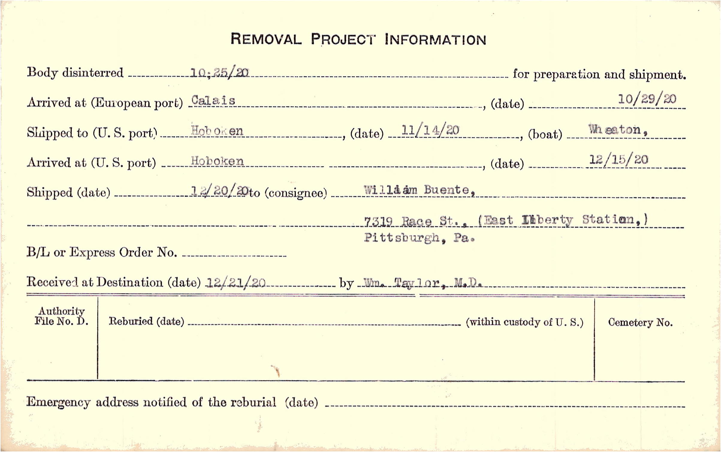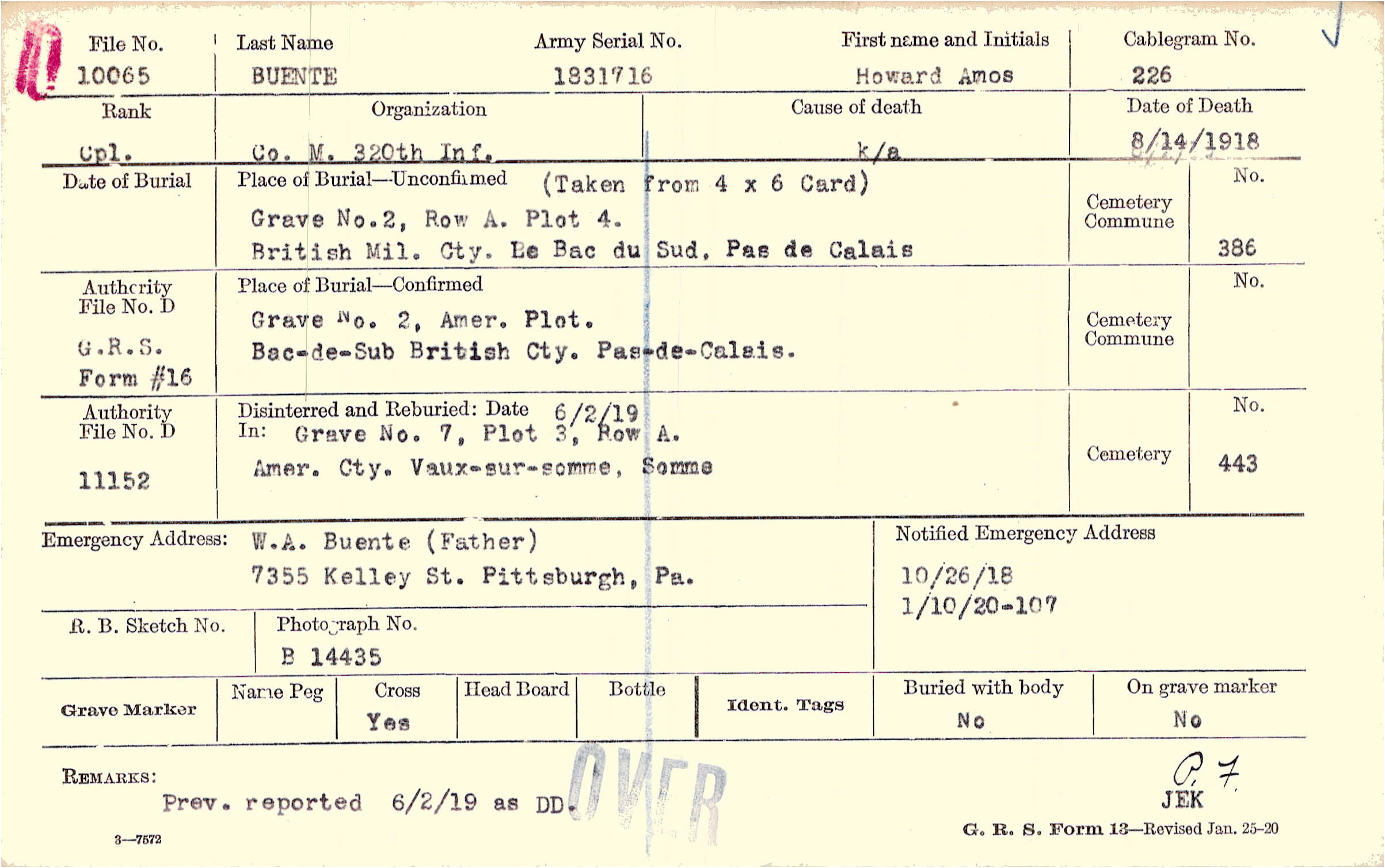 W. A. Buente (Father), 7355 Kelley St. Pittsburgh, Pa., Prev. reported 6/2/19 as DD.