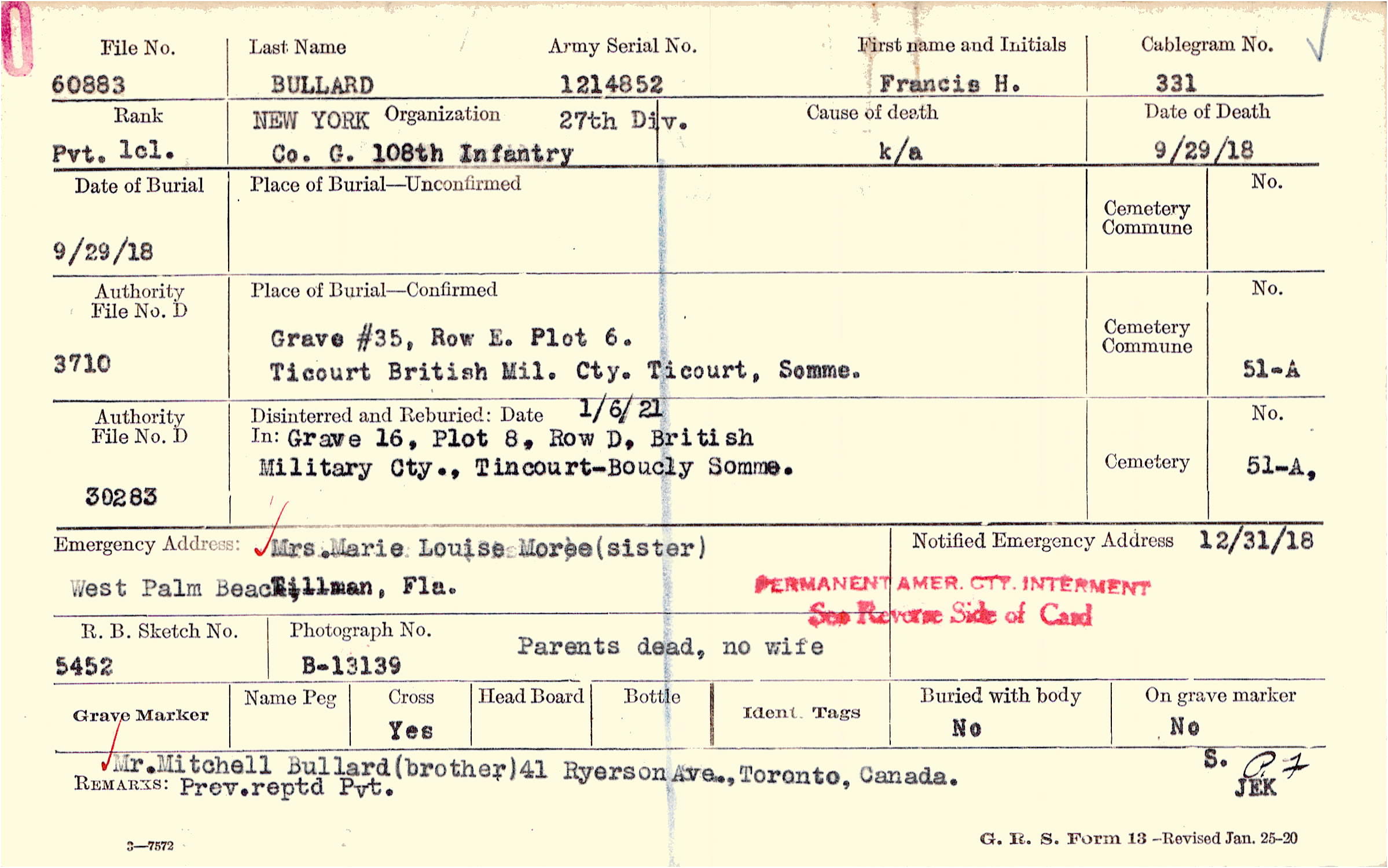 Mr. Mitchell Bullard (brother) 41 Ryerson Ave., Toronto, Canada. Prev.reptd Pvt.