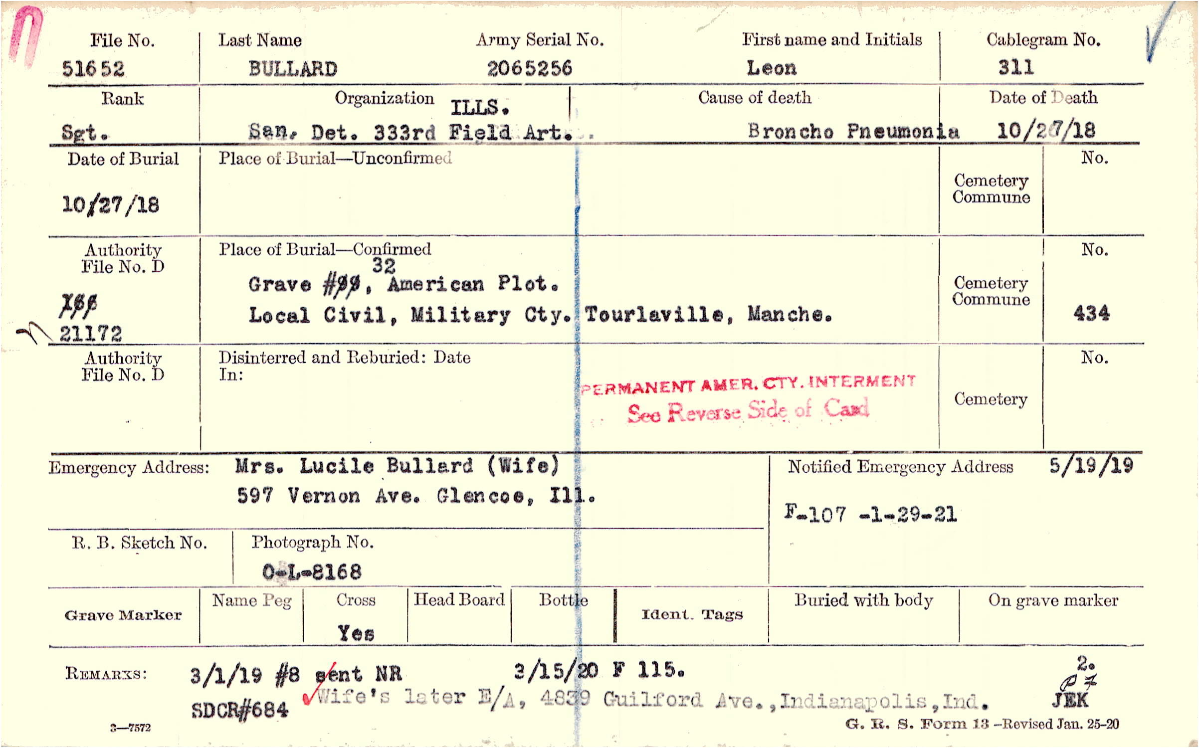 Mrs. Lucile Bullard (Wife), 597 Vernon Ave. Glencoe, Ill.