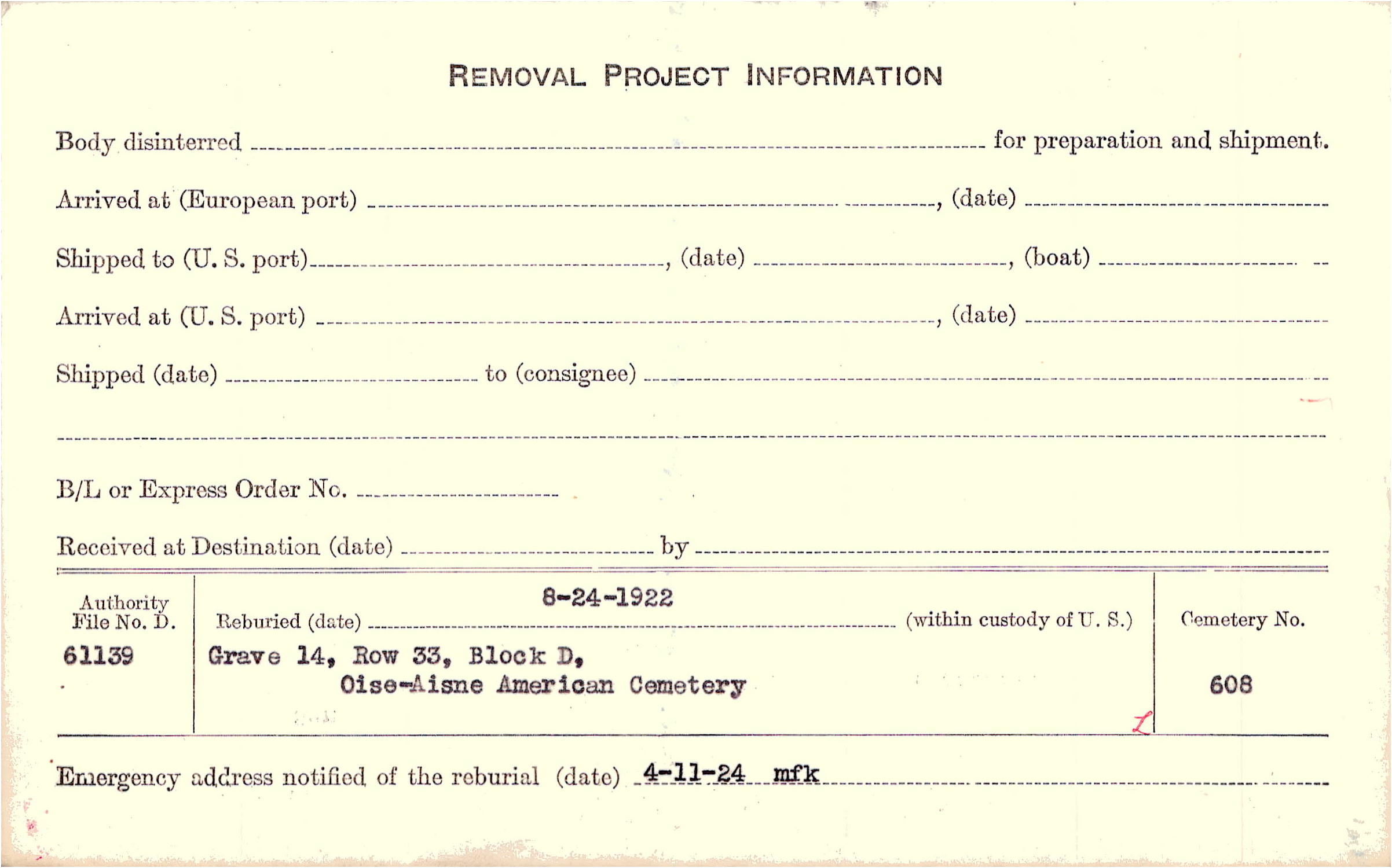 | Permanent Burial in Foreign Cemetery |