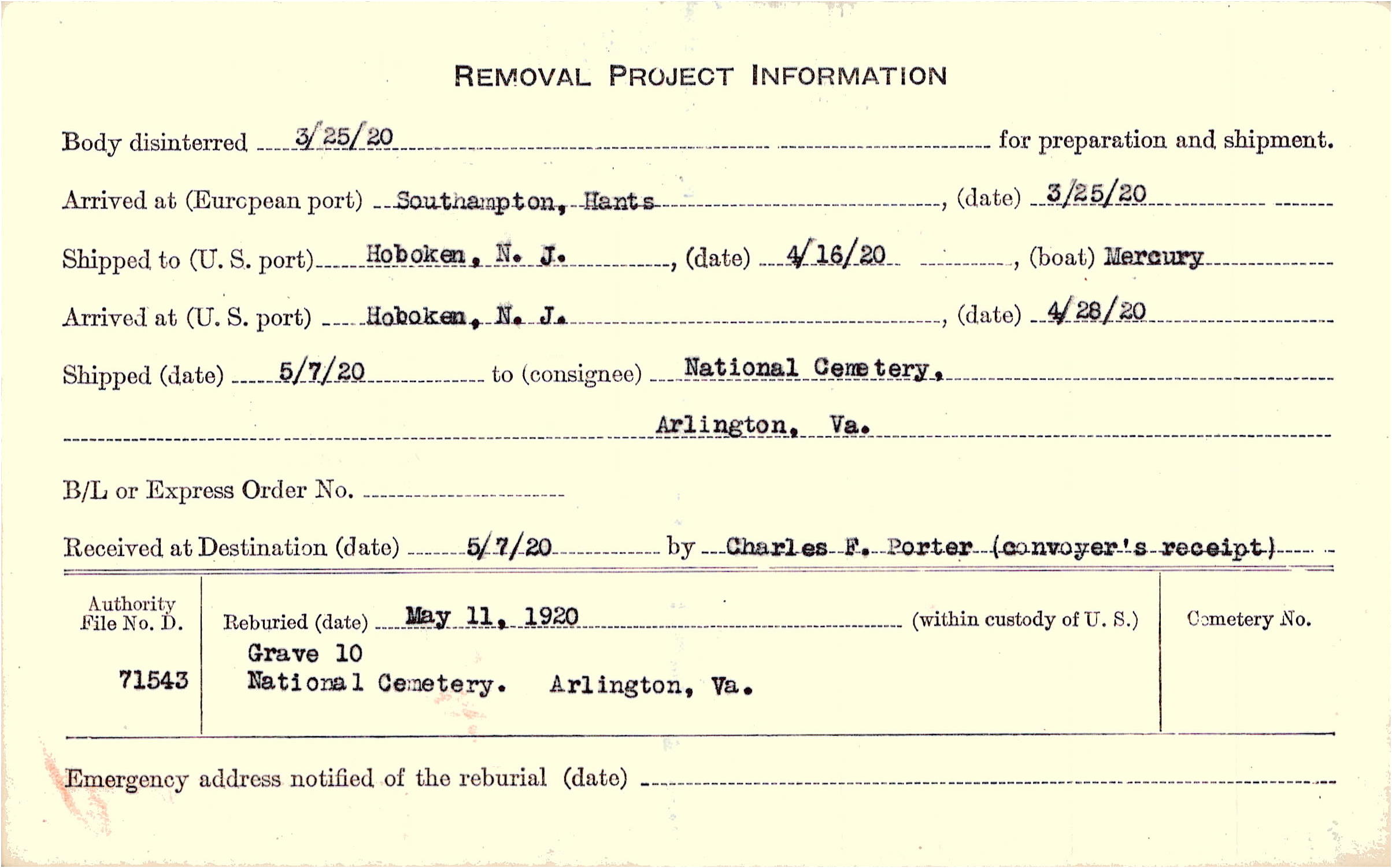 Body disinterred 3/25/1920 for preparation and shipment.