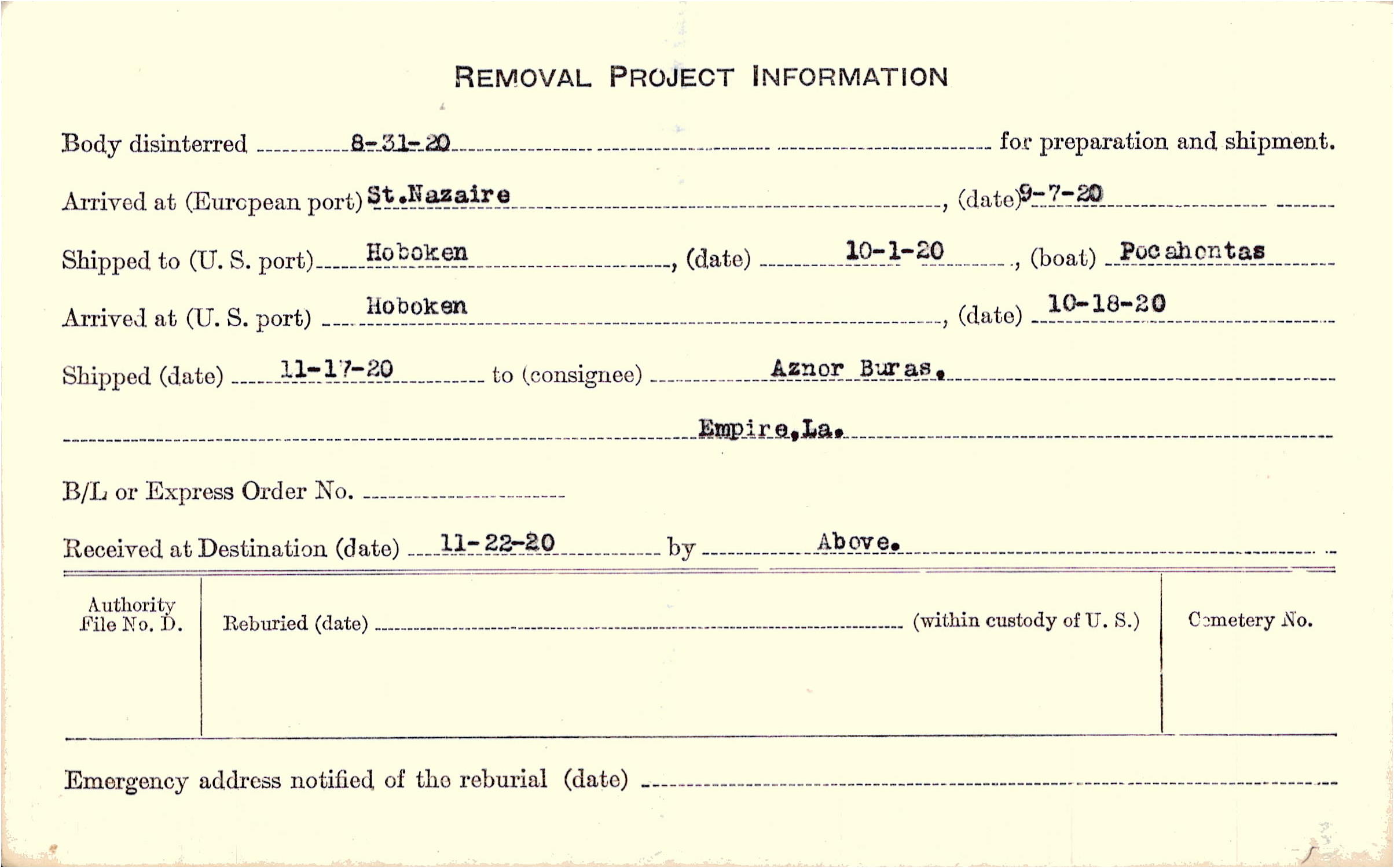 Body disinterred 8/31/1920 for preparation and shipment.