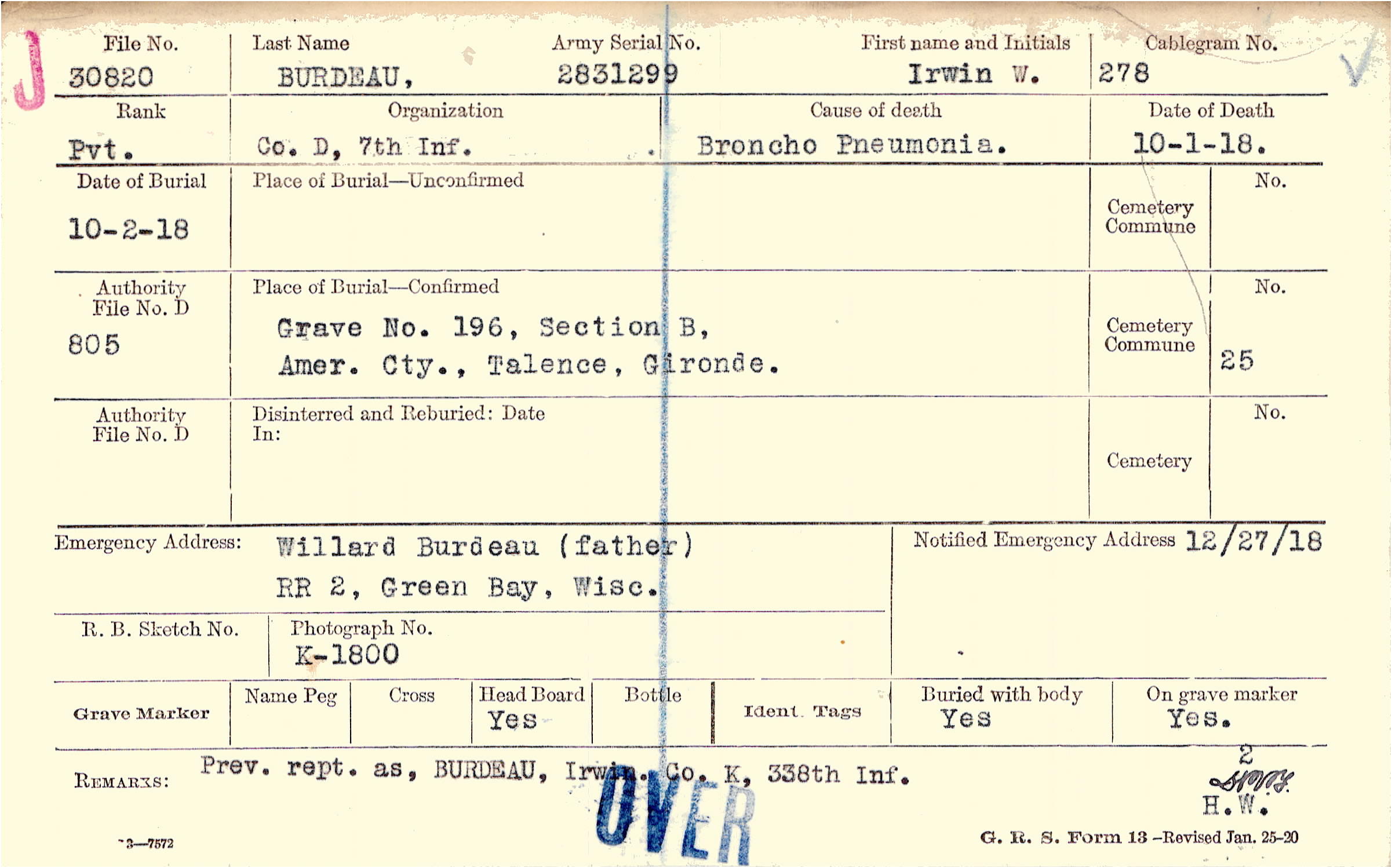 Prev. rept. as, BURDEAU, Irwin. Co. K, 338th Inf.