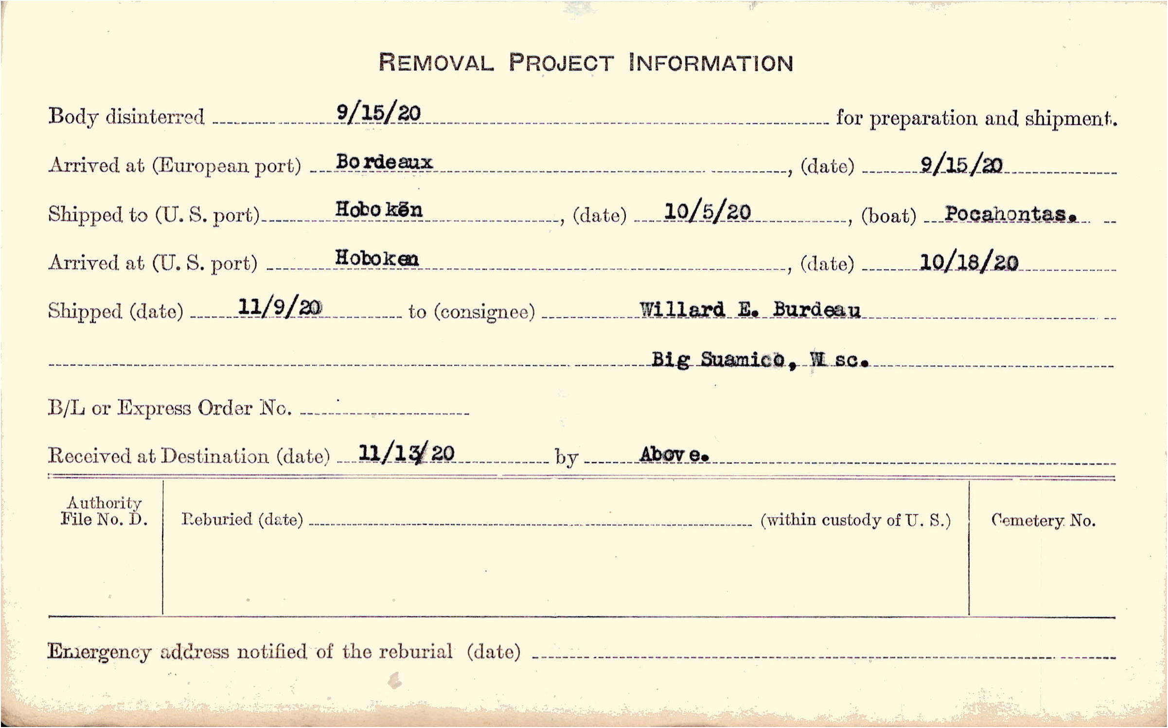 Body disinterred 9/15/1920 for preparation and shipment.