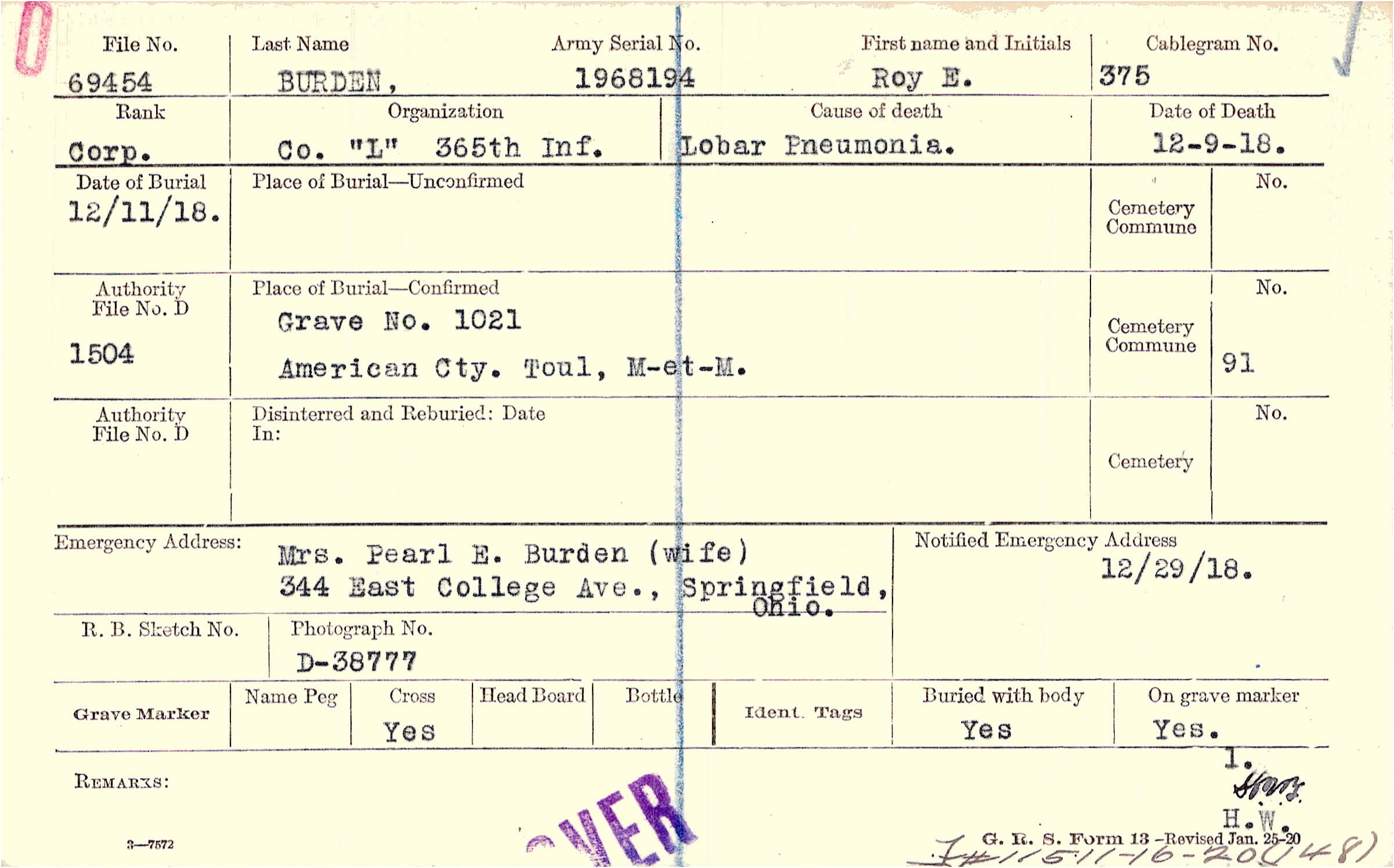 Mrs. Pearl E. Burden (wife), 344 East College Ave., Springfield, Ohio.