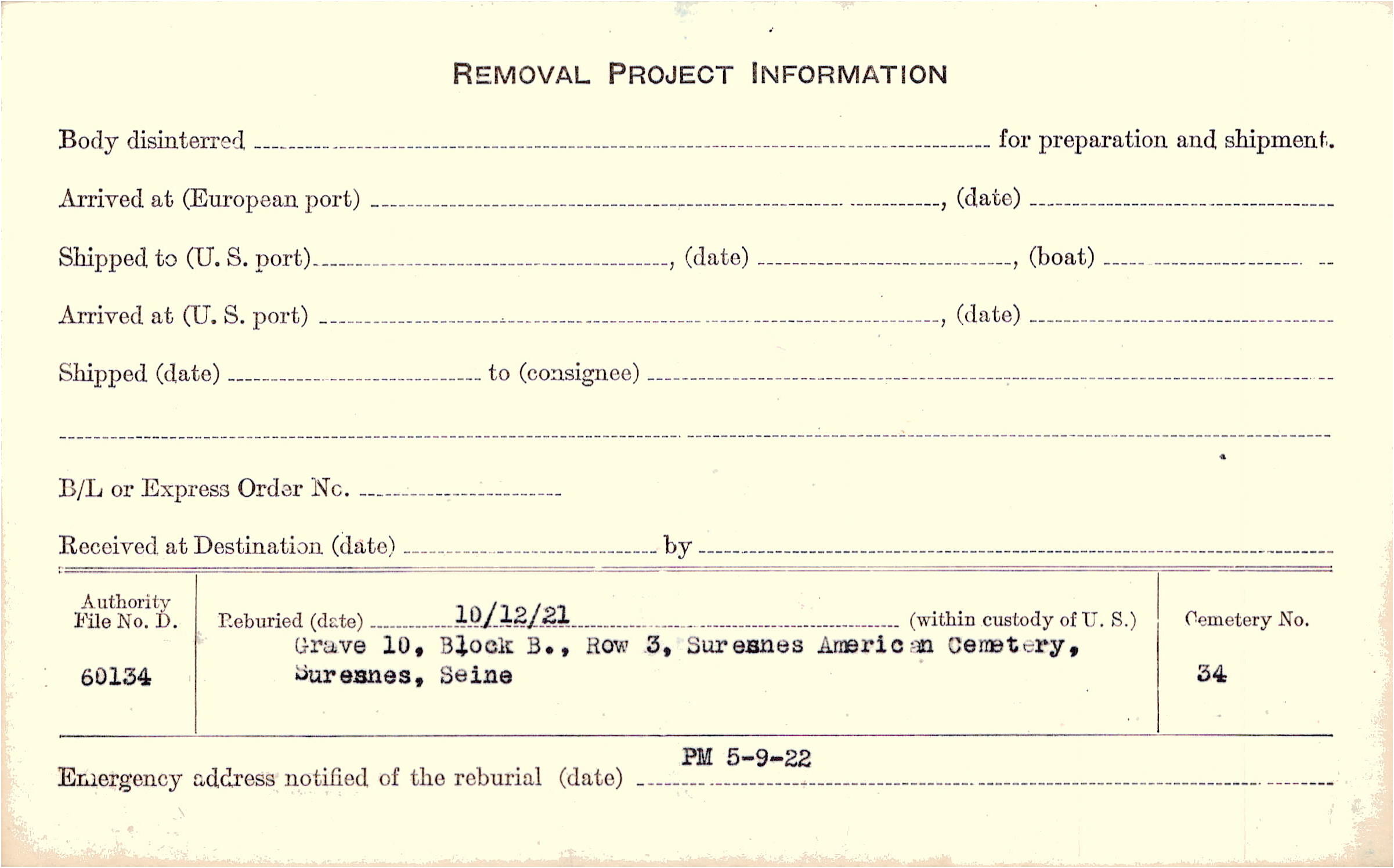 | Permanent Burial in Foreign Cemetery |