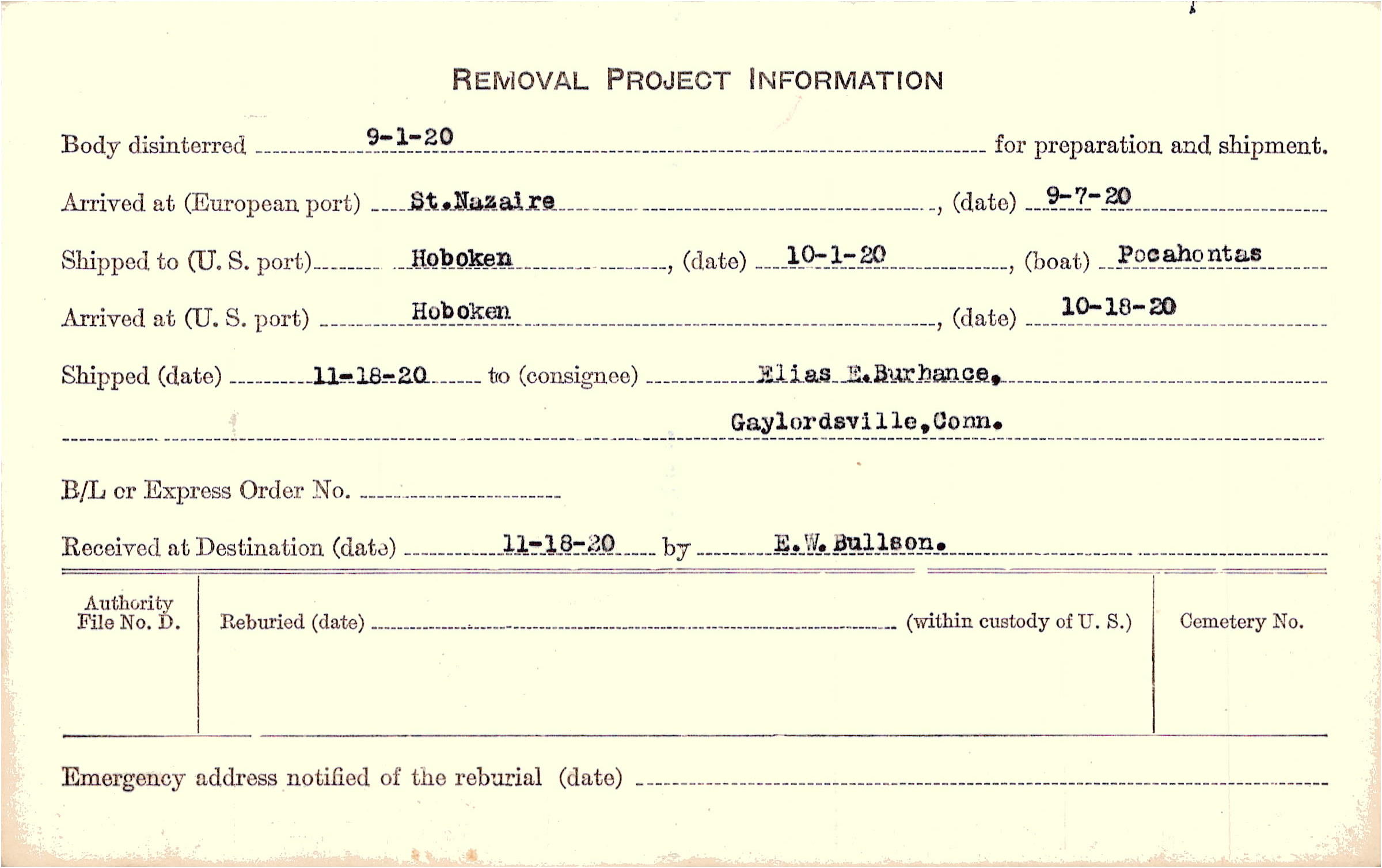 Body disinterred 9/1/1920 for preparation and shipment.