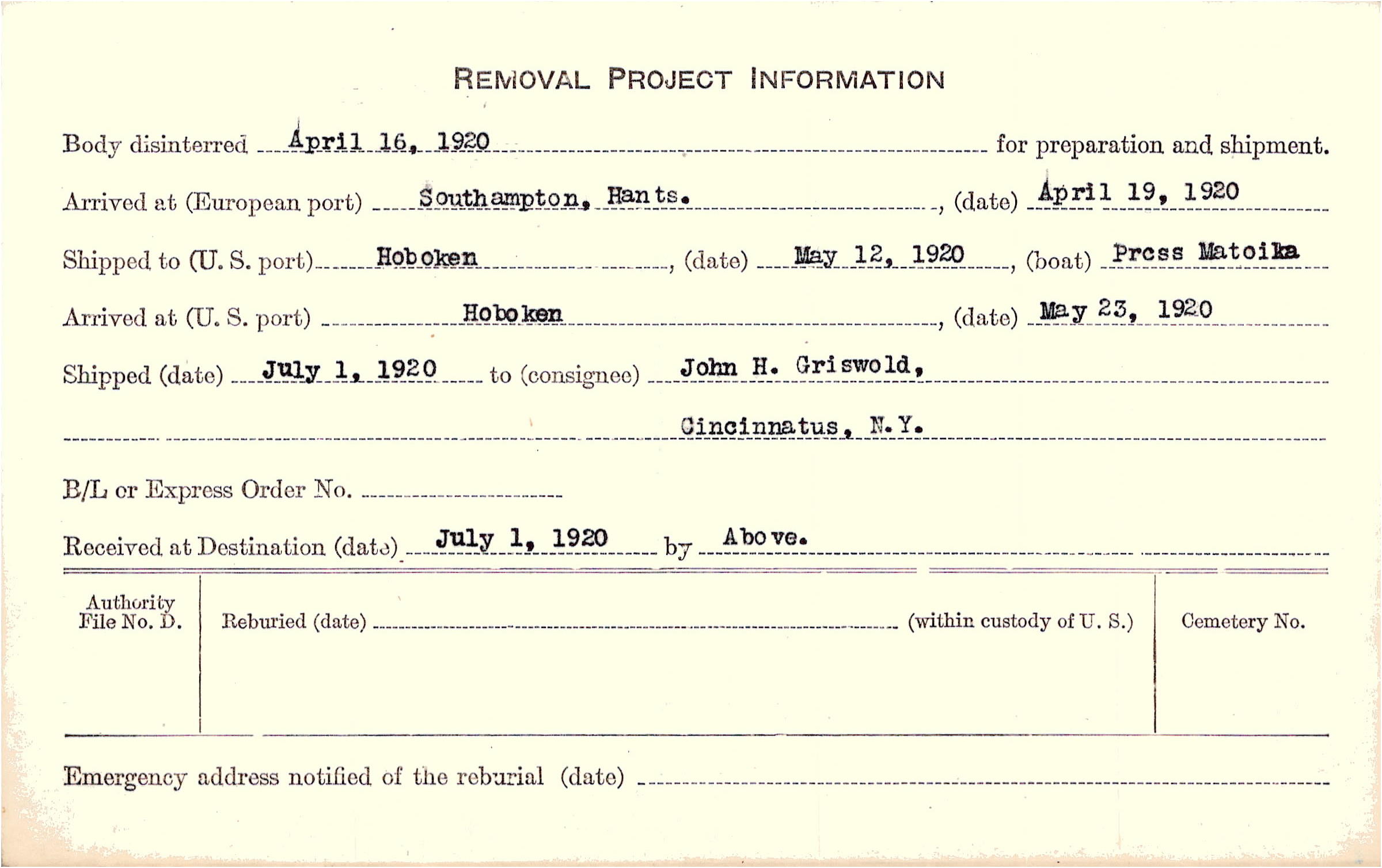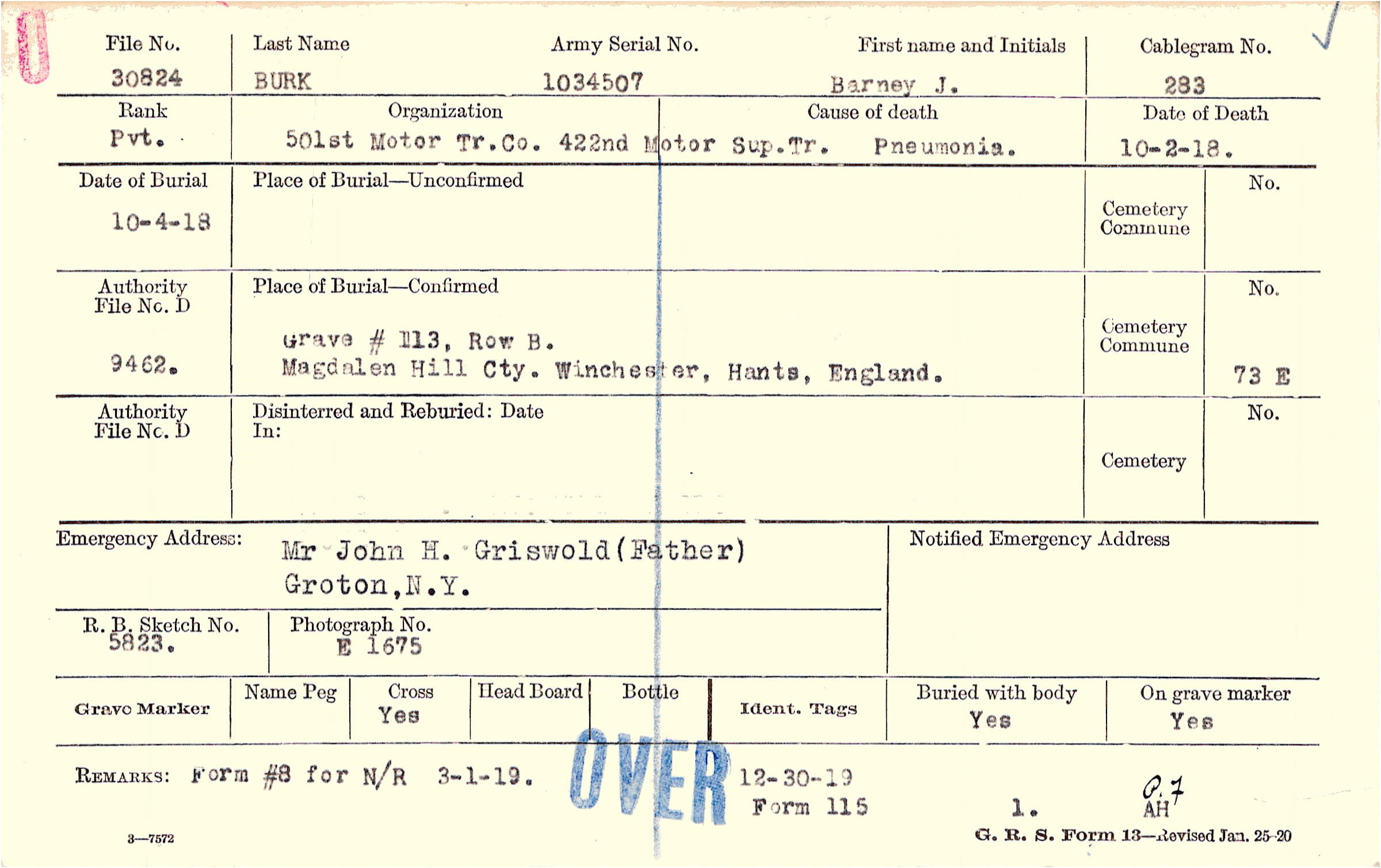 Grave # 113, Row B, Magdalen Hill Cty., Winchester, Hants, England.