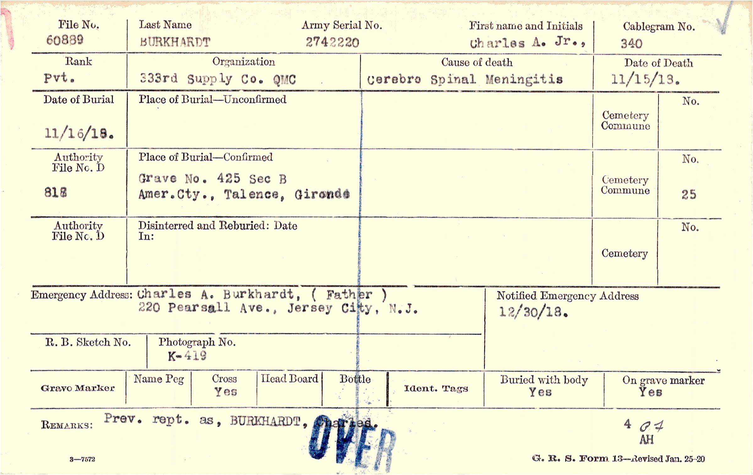 Charles A. Burkhardt, (Father), 220 Pearsall Ave., Jersey City, N.J.