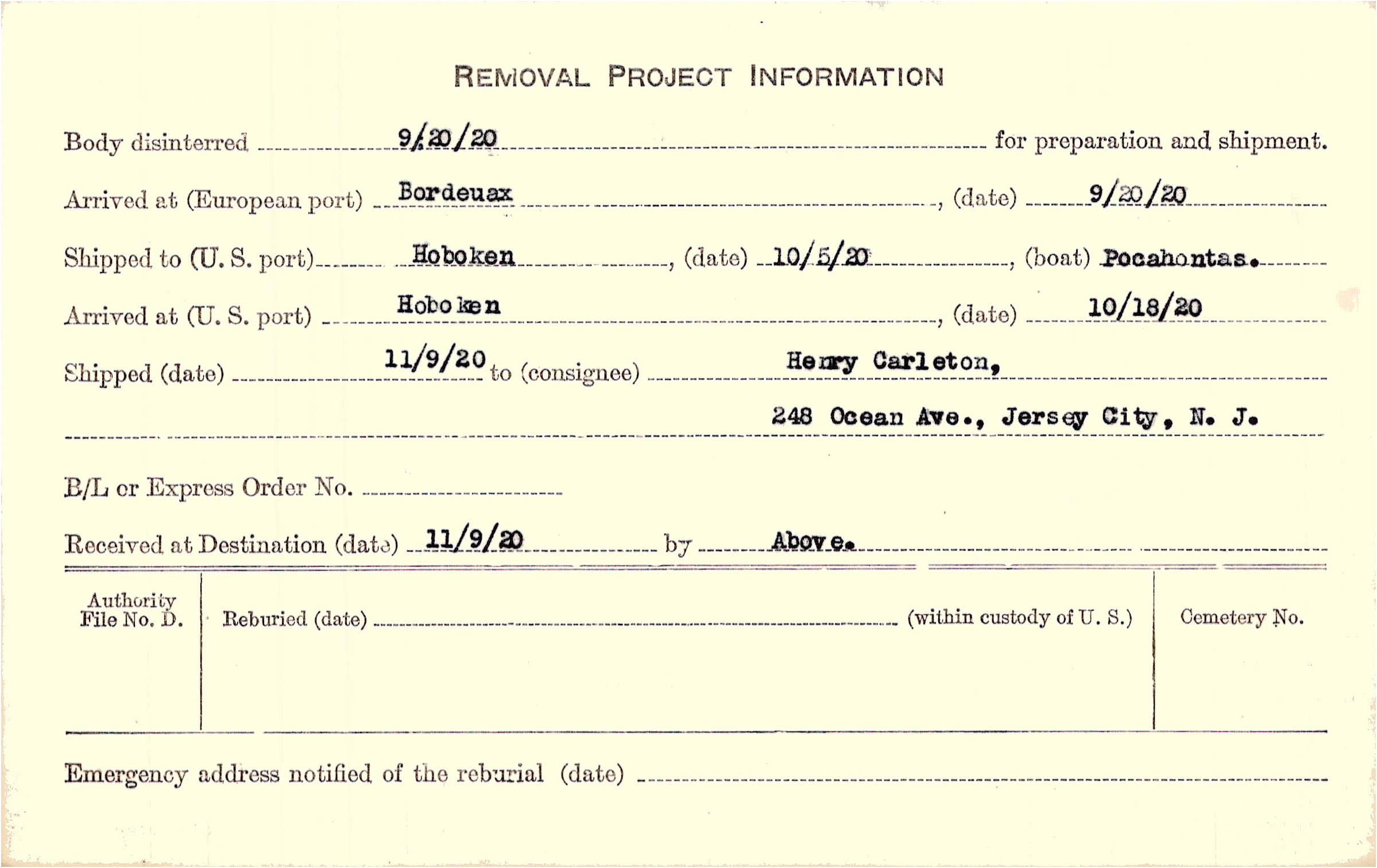 Body disinterred 9/20/1920 for preparation and shipment.