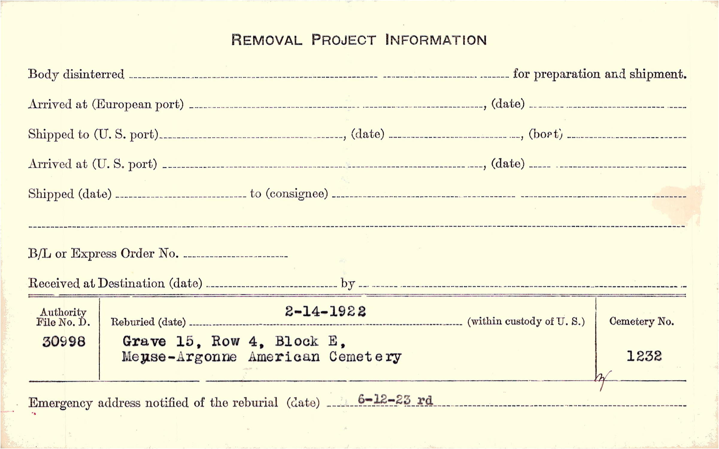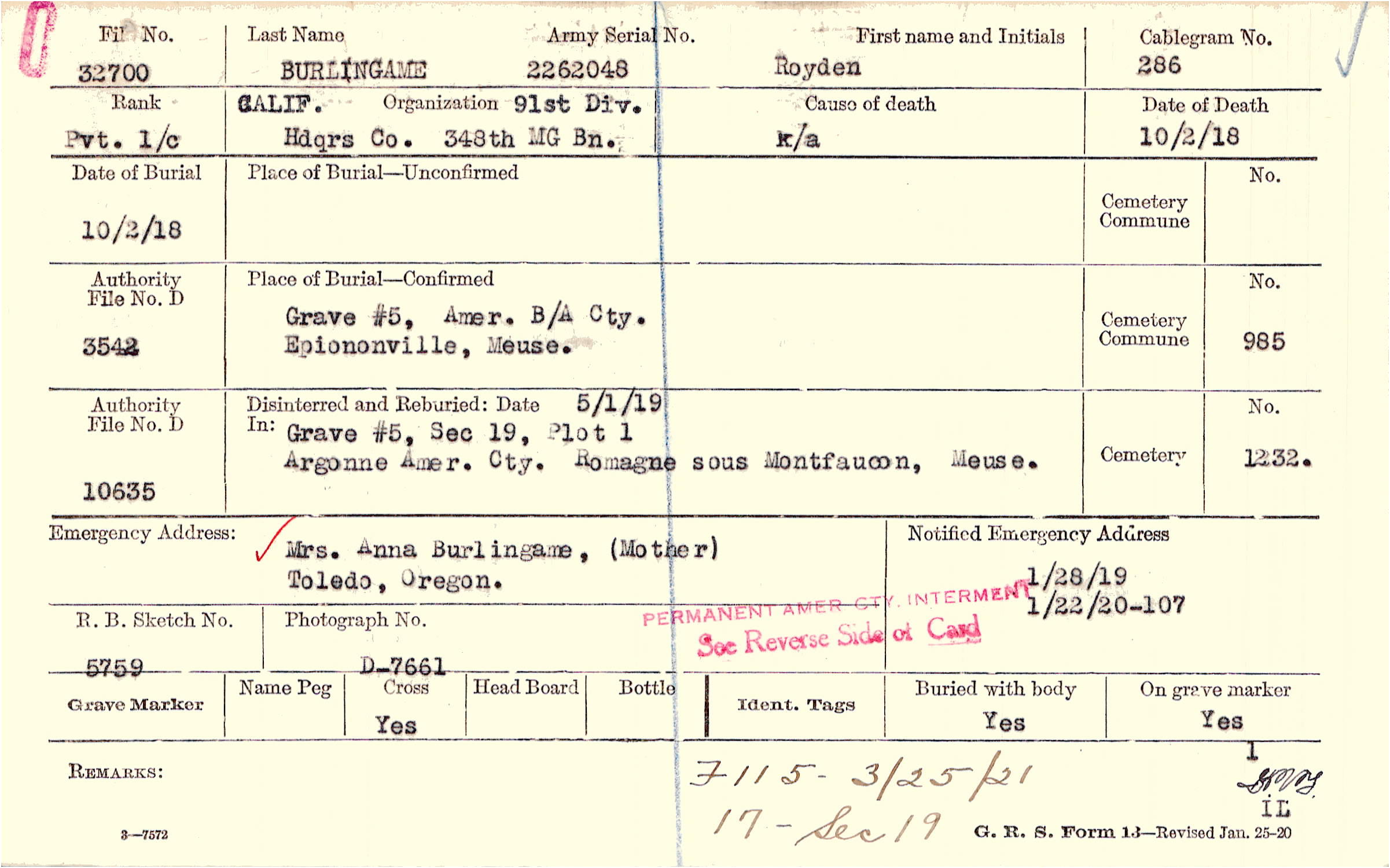 Grave 5, Section 19, Plot 1, Argonne American Cemetery, Romagne-sous-Montfaucon, Meuse