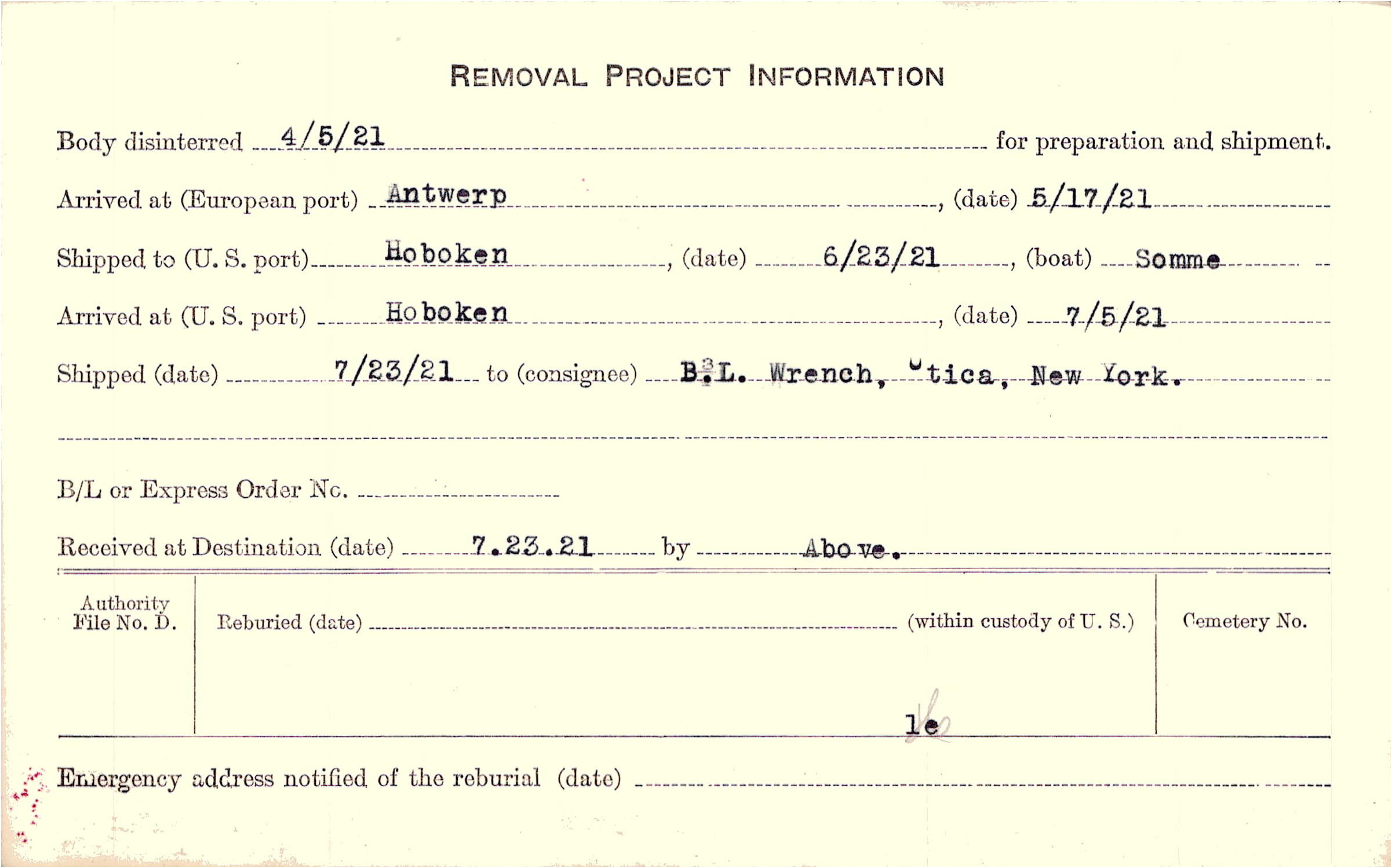Body disinterred 4/5/1921 for preparation and shipment.