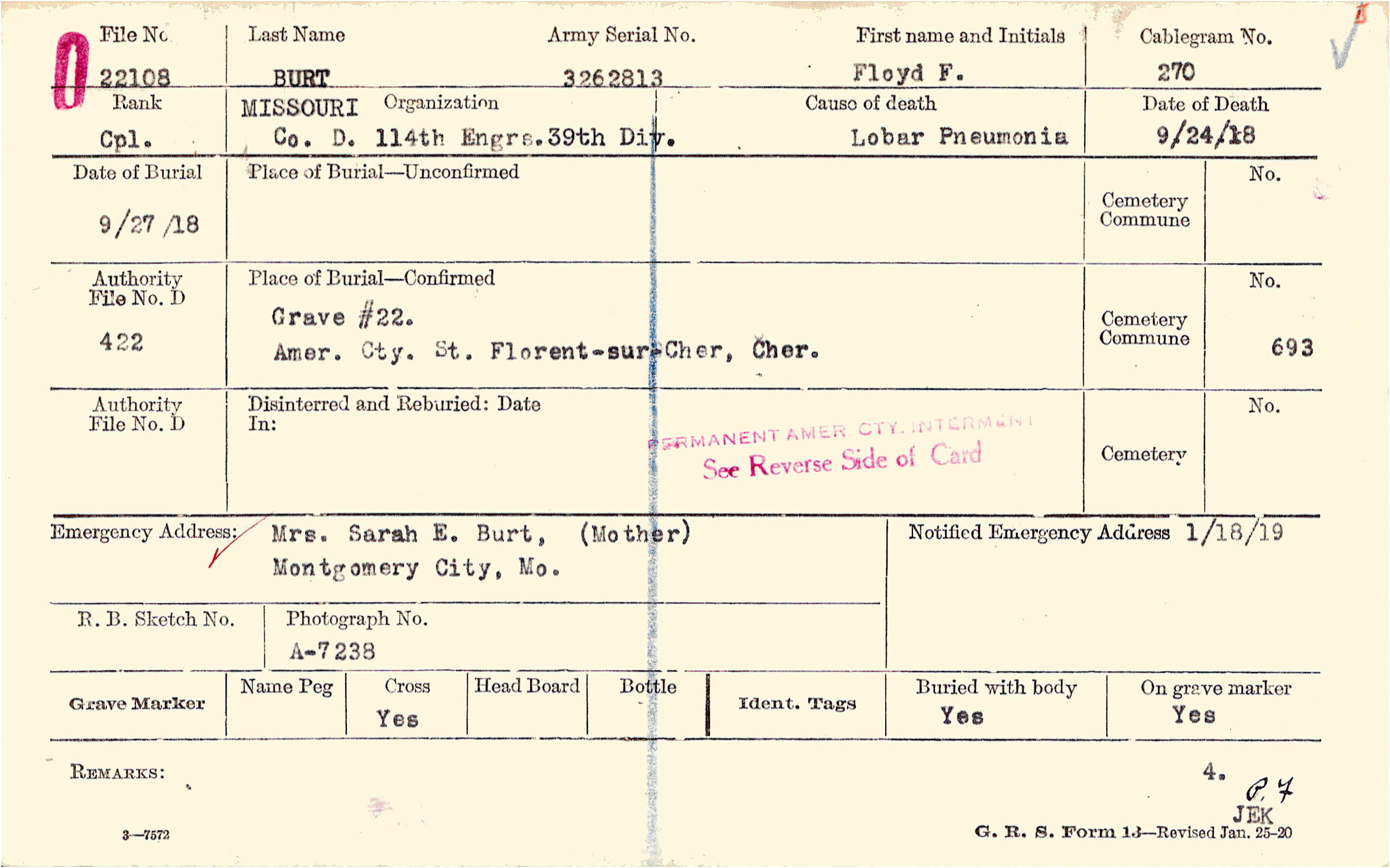 Grave #22, Amer. Cty., St. Florent-sur-Cher, Cher