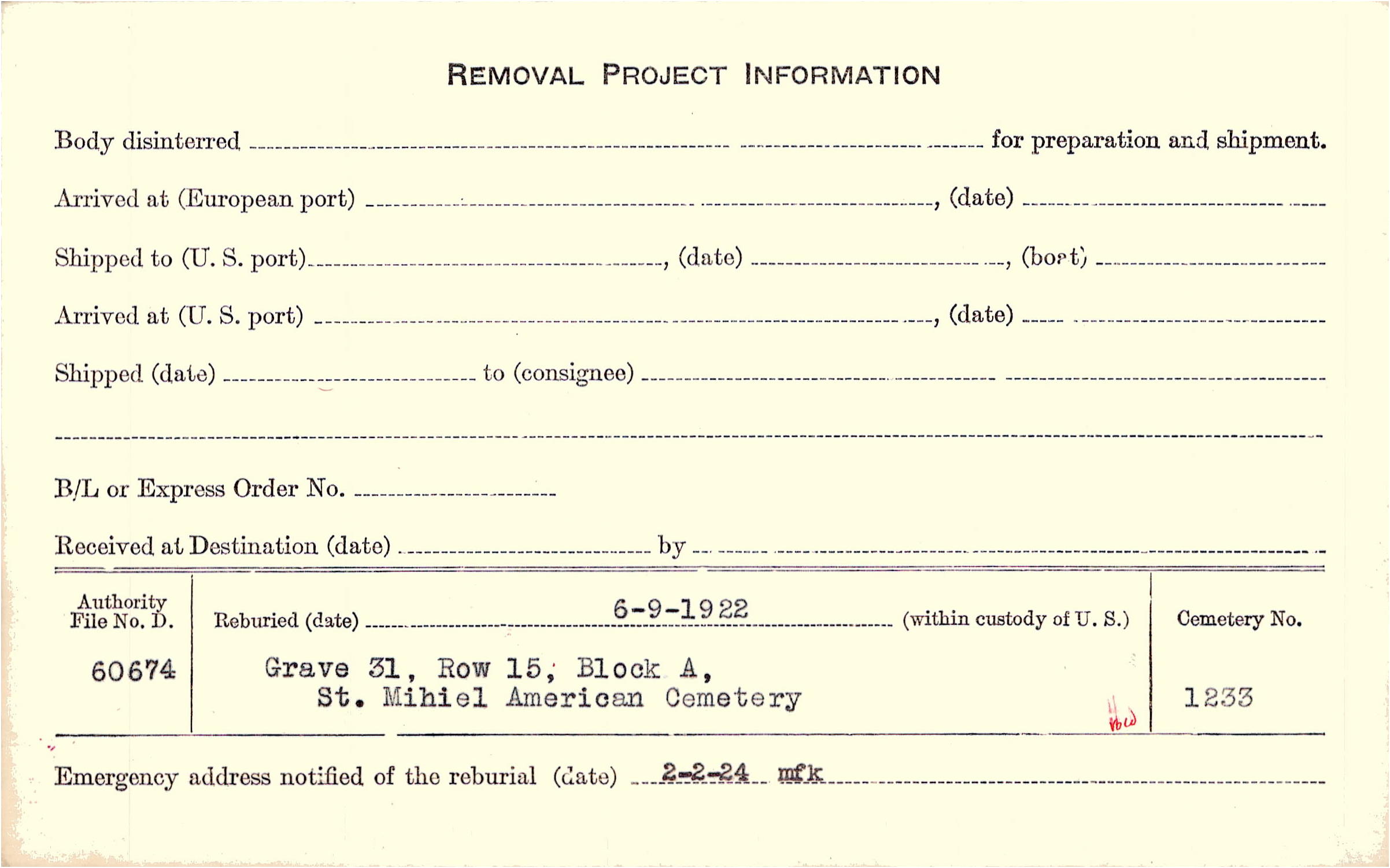 | Permanent Burial in Foreign Cemetery |