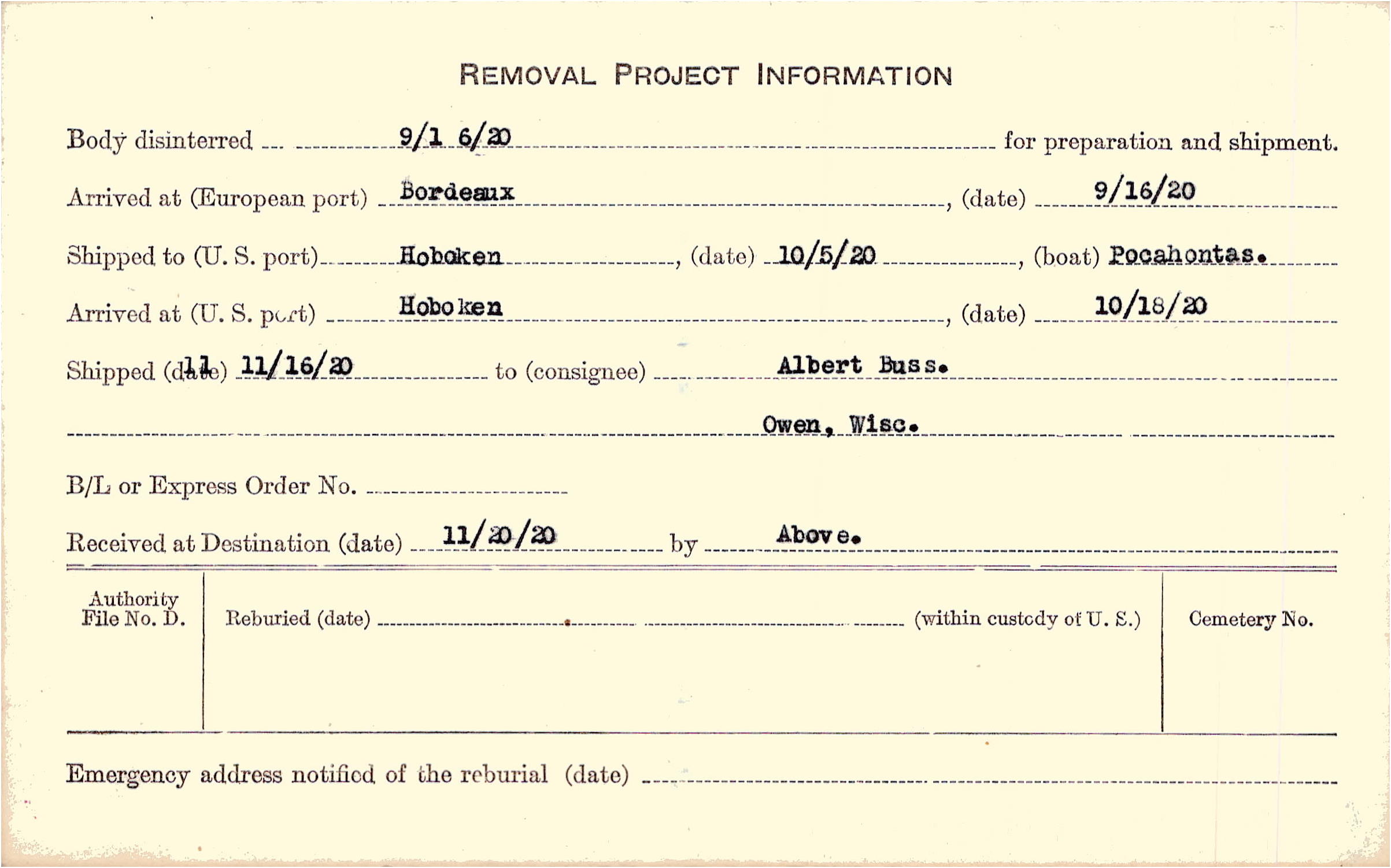Body disinterred 9/16/1920 for preparation and shipment.