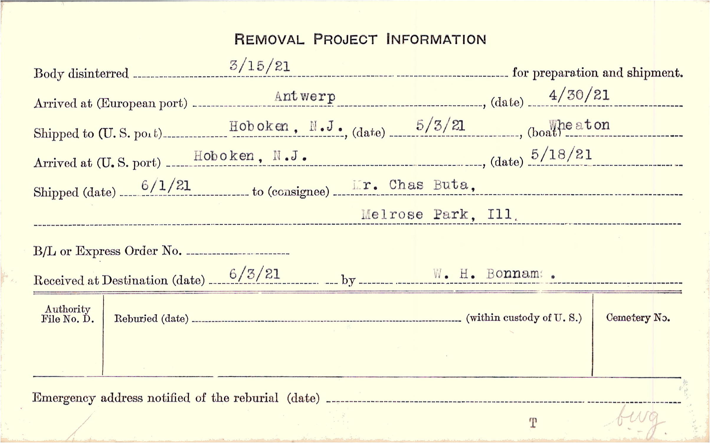 Body disinterred 3/15/1921 for preparation and shipment.