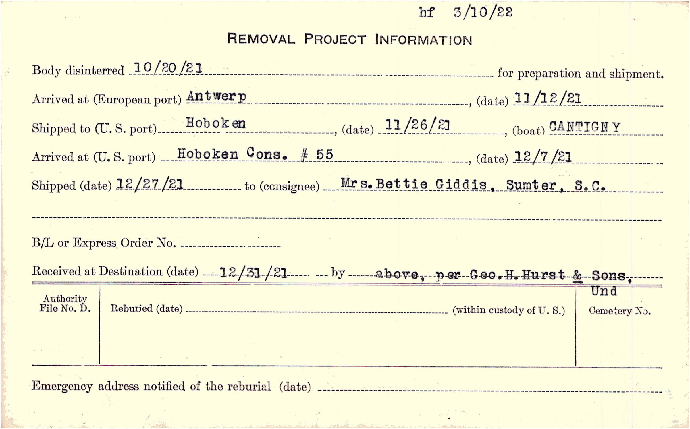 Body disinterred 10/20/1921 for preparation and shipment.