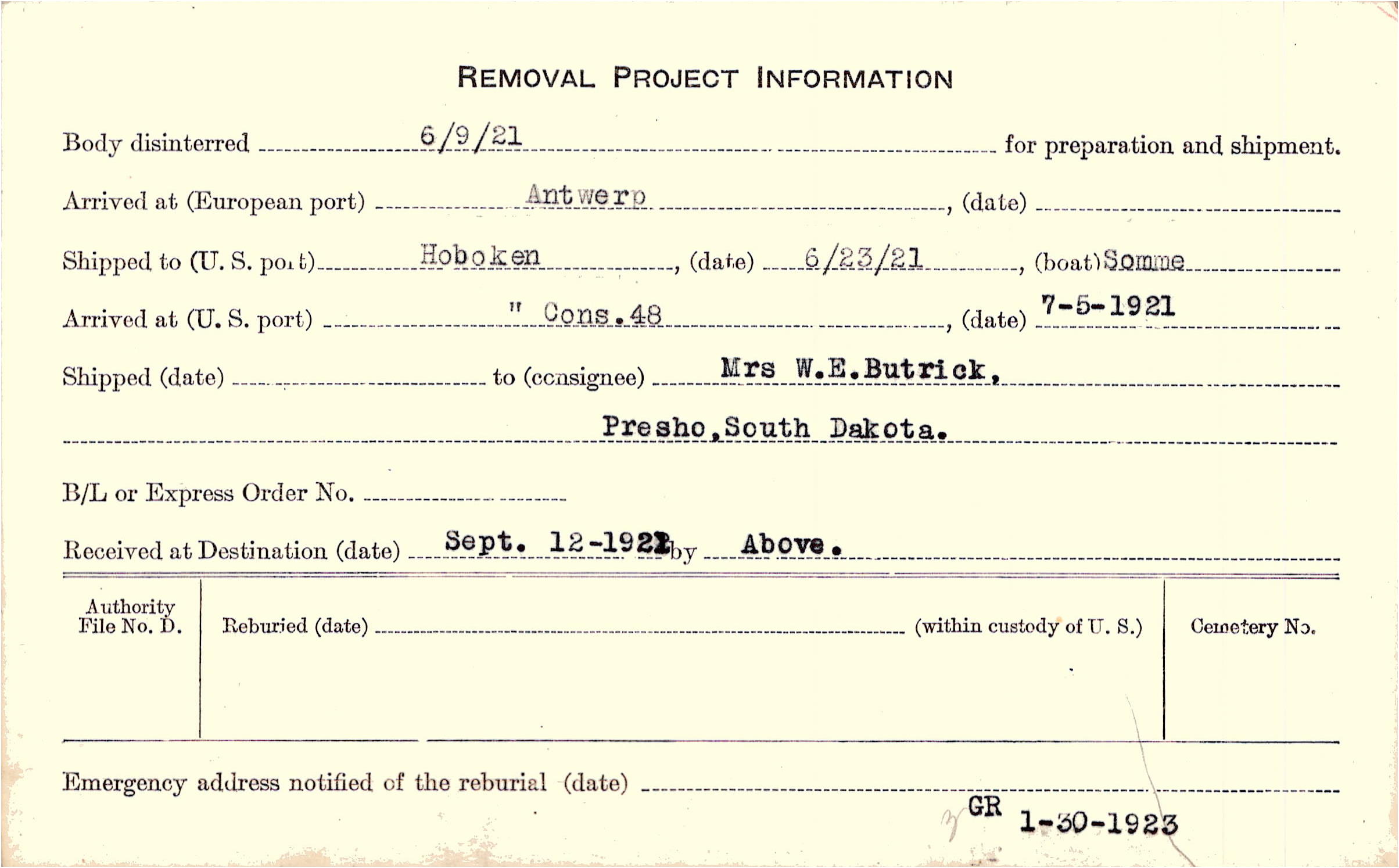Body disinterred 6/9/1921 for preparation and shipment.