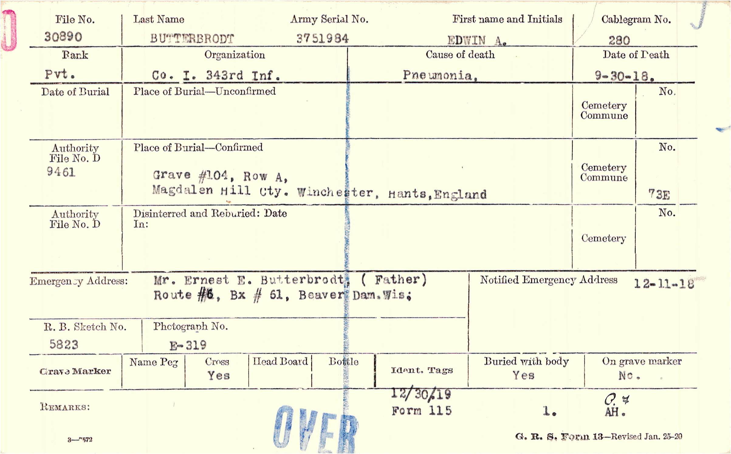 Mr. Ernest E. Butterbrodt, (Father), Route #6, Bx # 61, Beaver Dam, Wis;