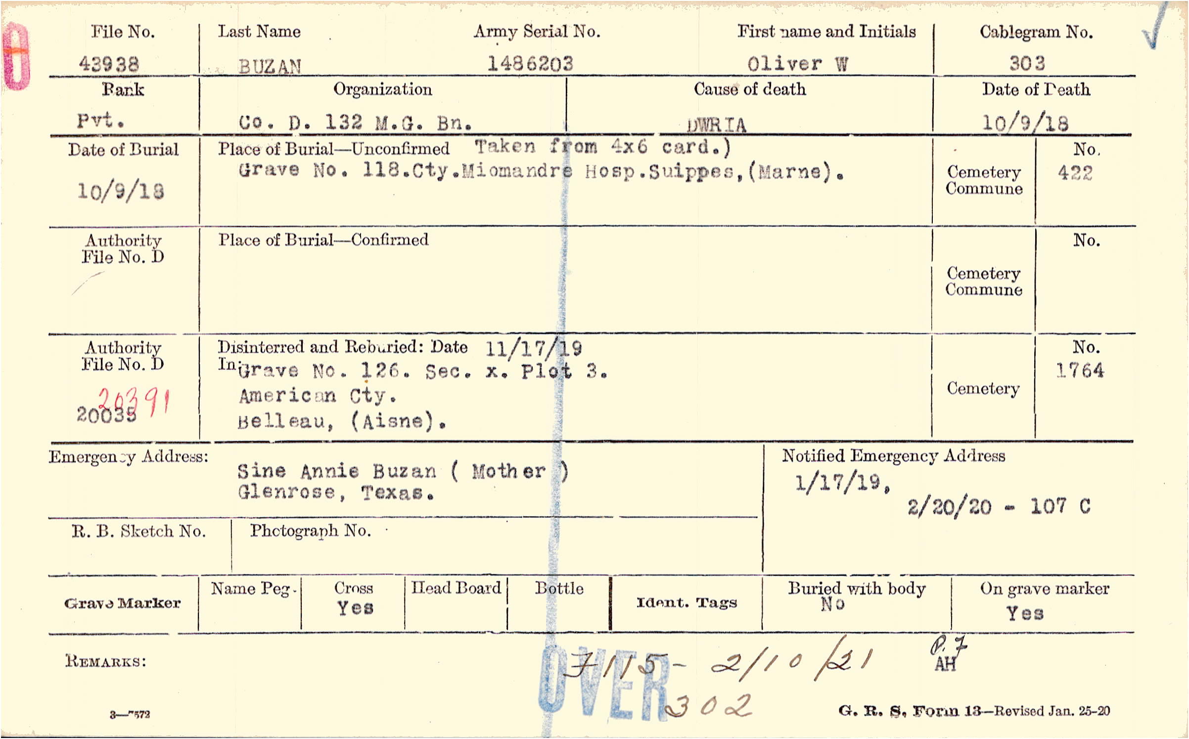 Grave 126, Section X, Plot 3, American Cemetery, Belleau, Aisne