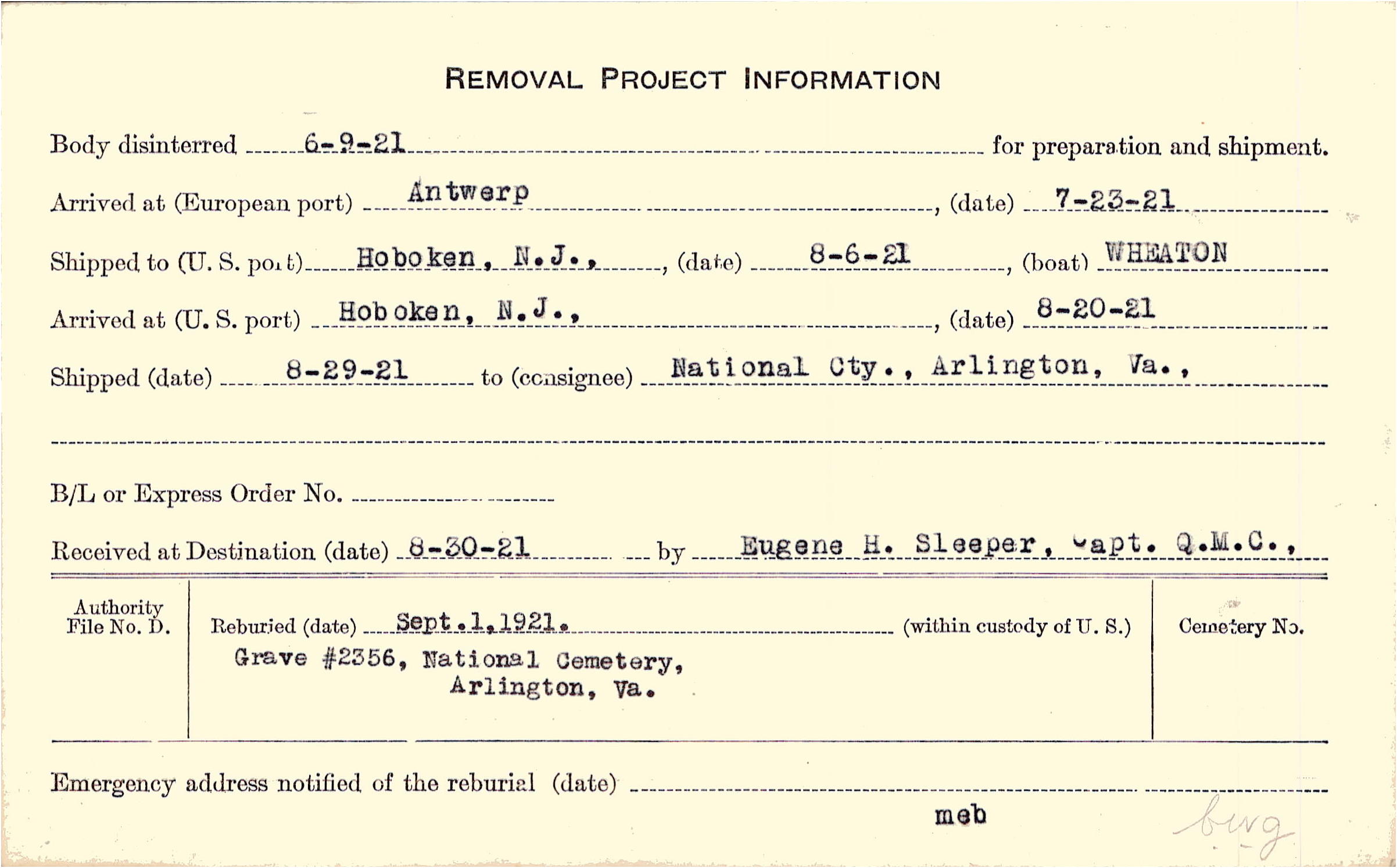 Body disinterred 6/9/1921 for preparation and shipment.