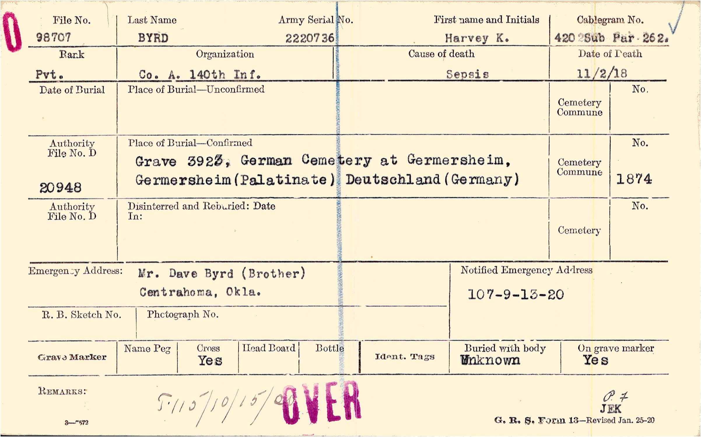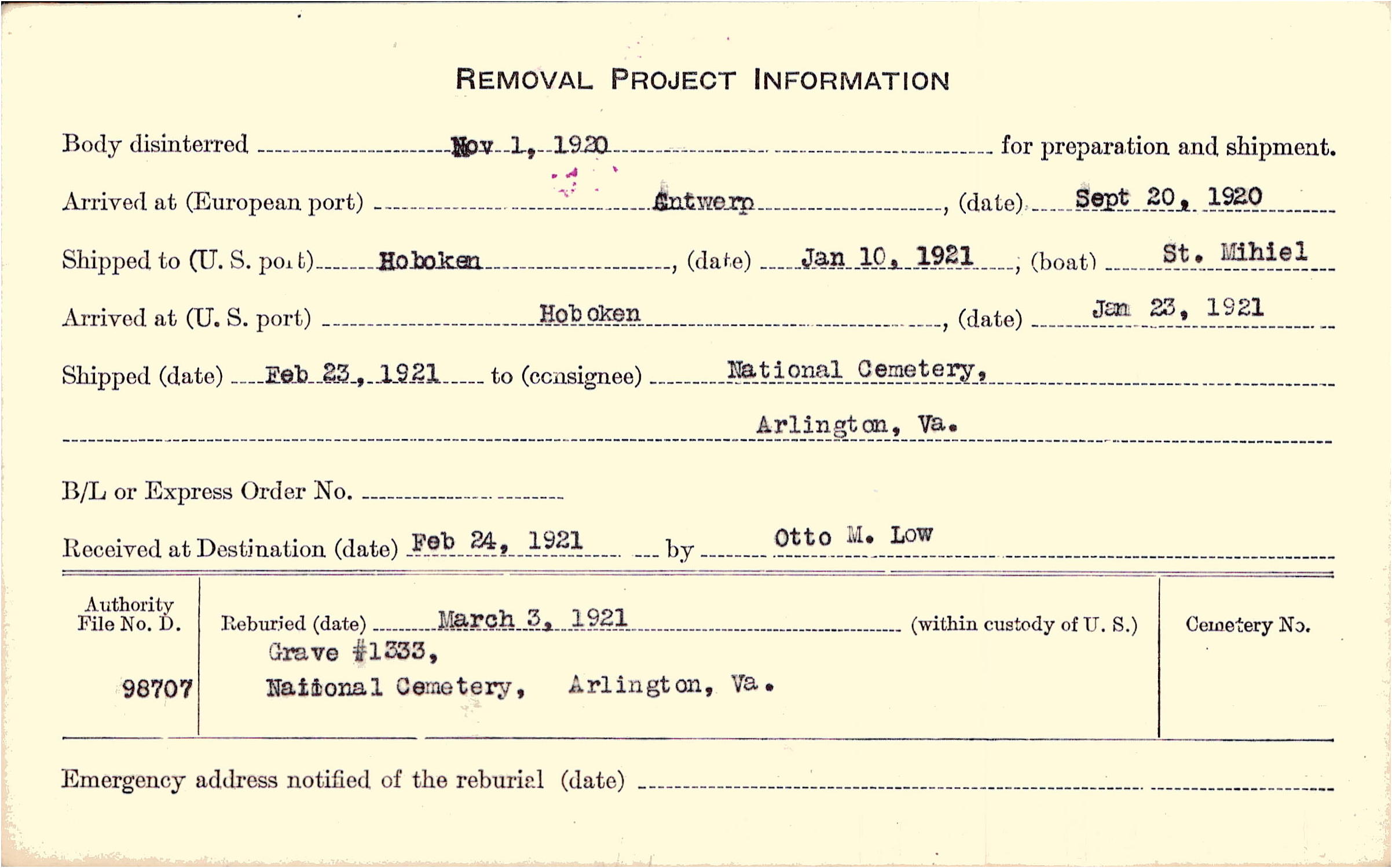 Body disinterred 11/1/1920 for preparation and shipment.