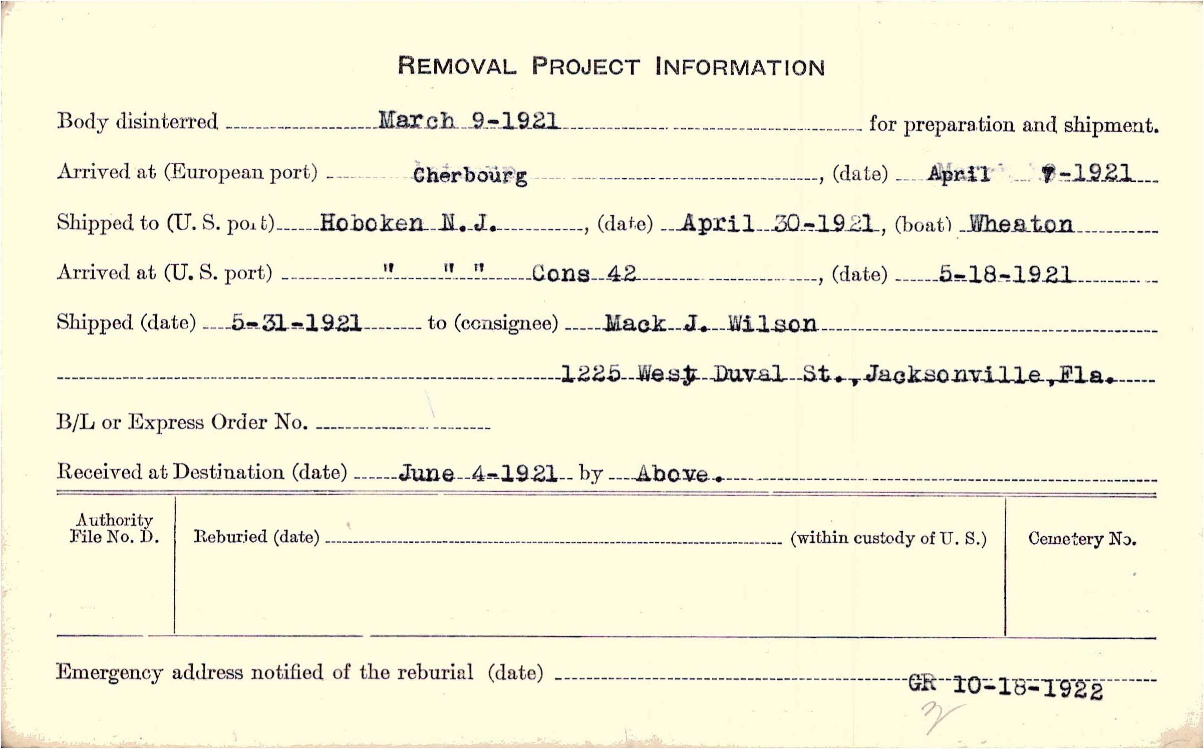 Body disinterred 3/9/1921 for preparation and shipment.