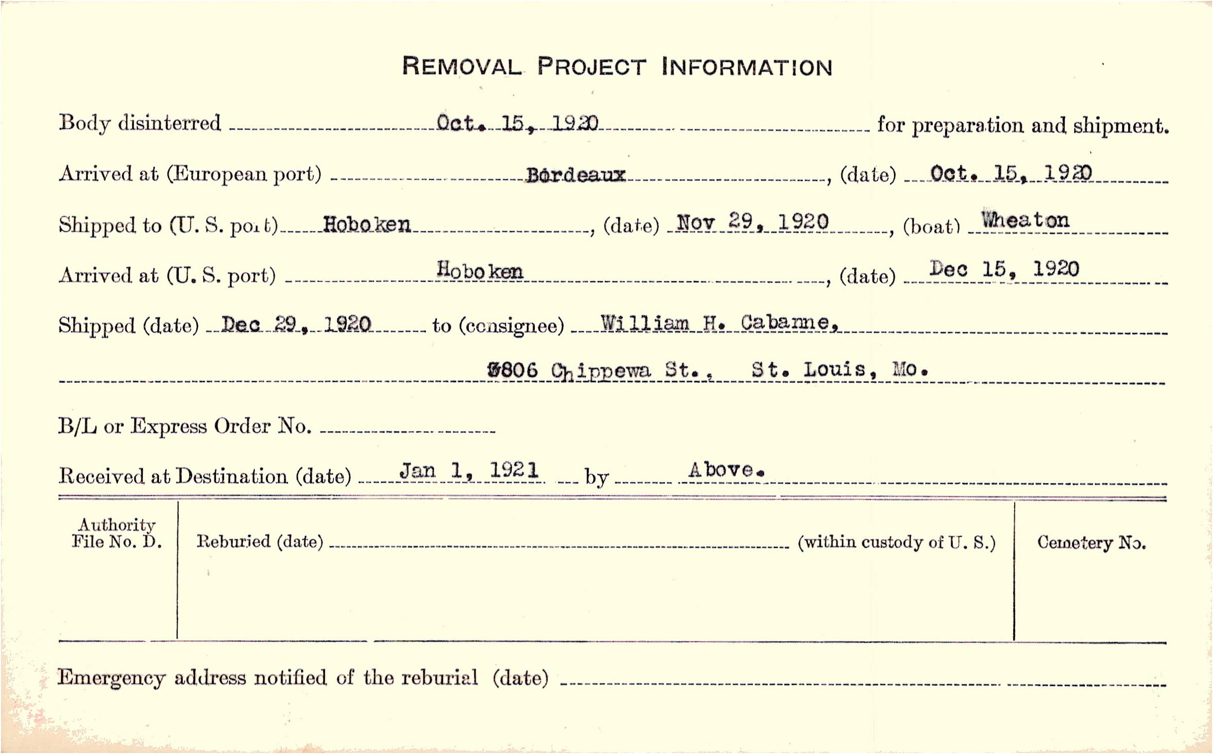 Body disinterred 10/15/1920 for preparation and shipment.
