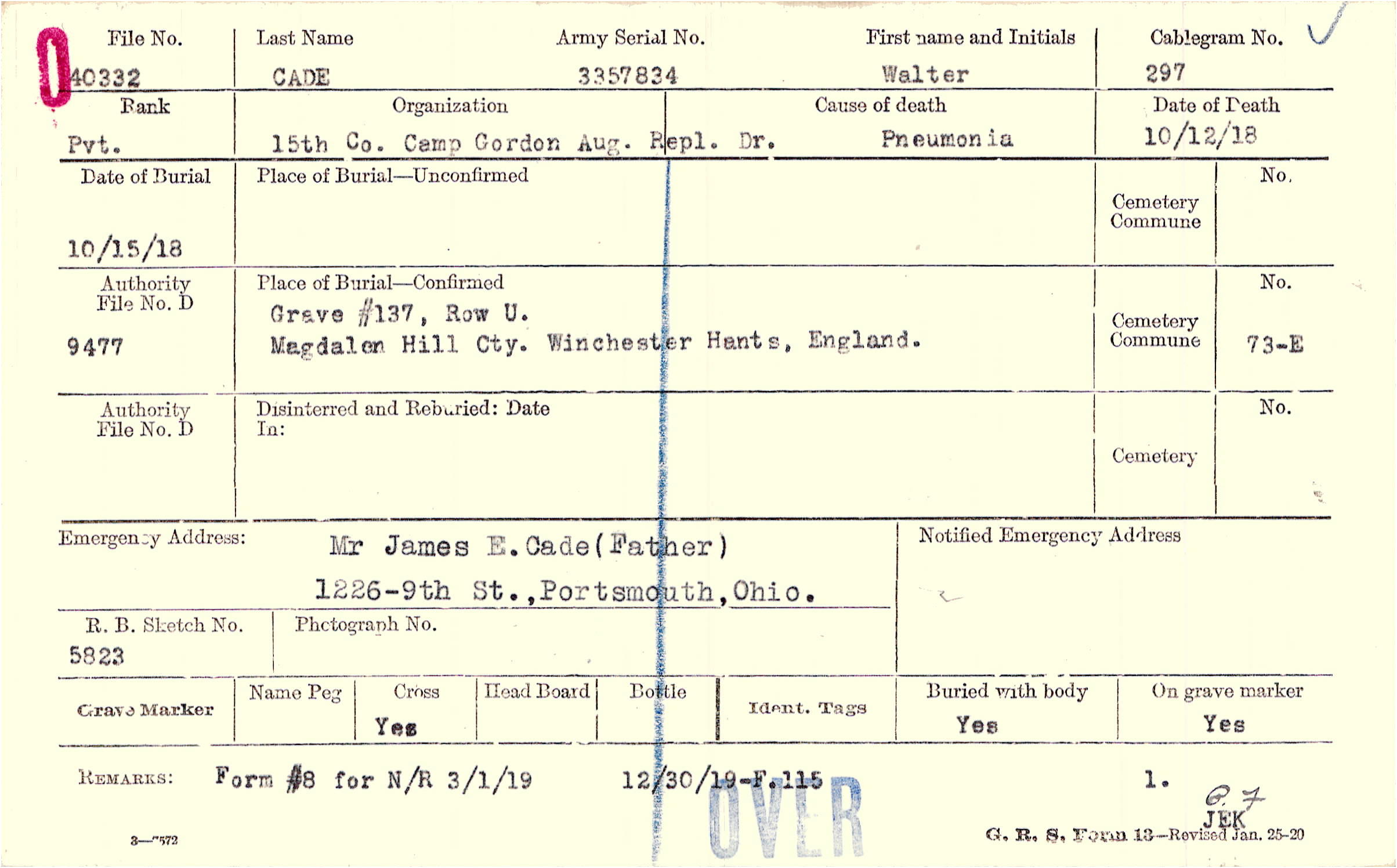 Mr. James E. Cade (Father), 1226-9th St.,Portsmouth, Ohio.
