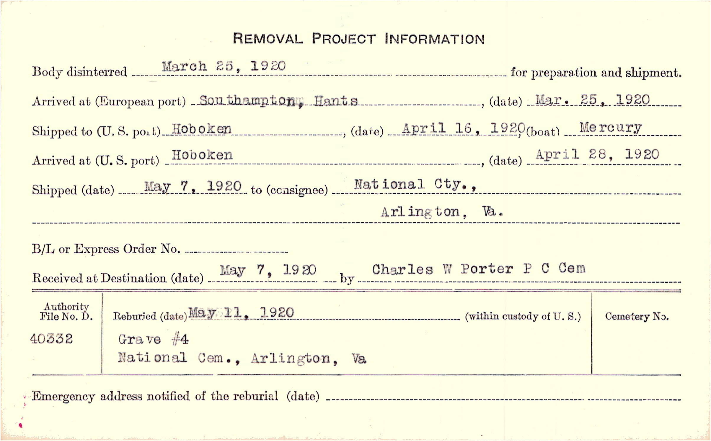Body disinterred 3/25/1920 for preparation and shipment.