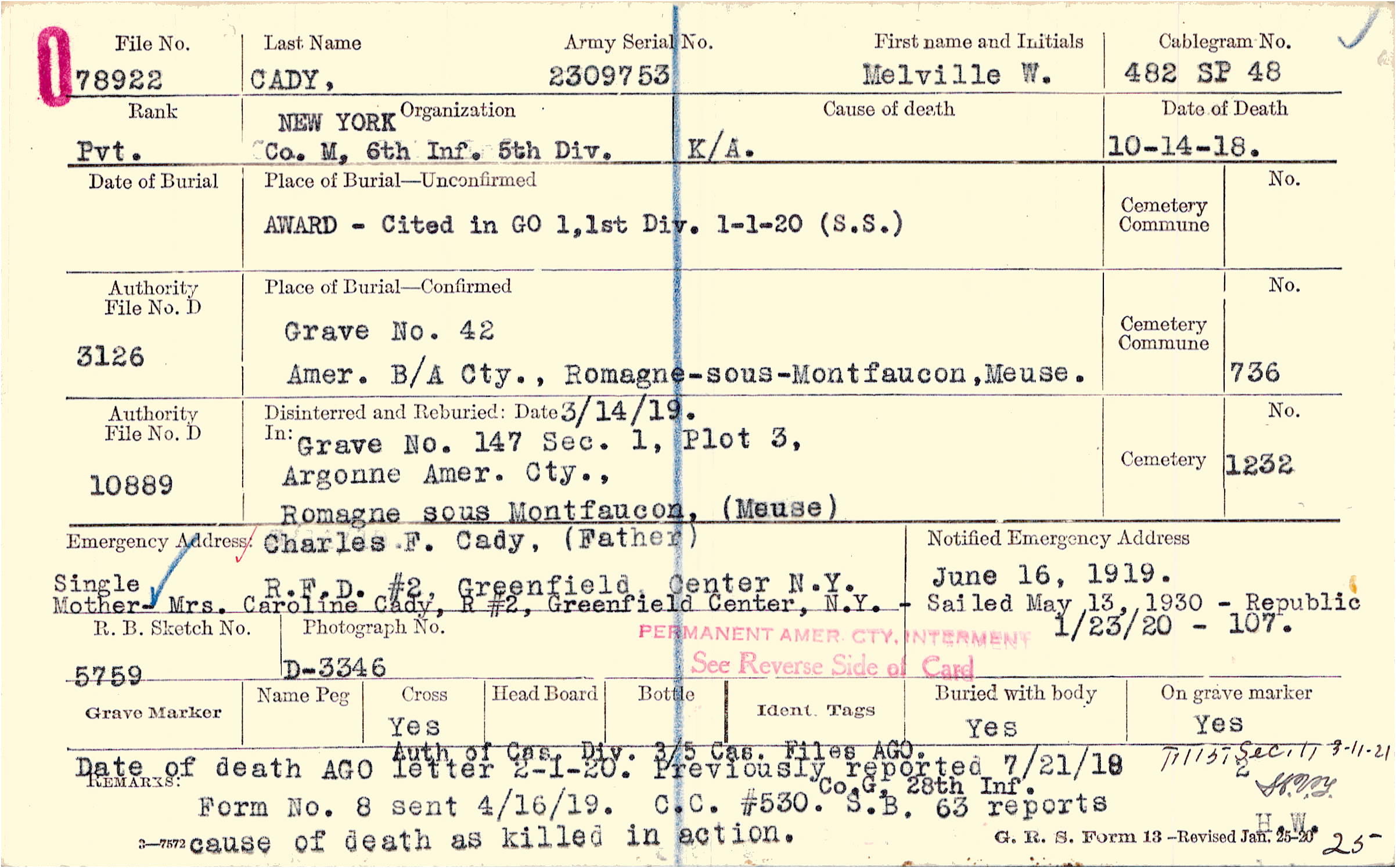 Auth of Cas. Div. 3/5 Cas. Files AGO. Date of death AGO letter 2-1-20. Previously reported 7/21/18 Co. G, 28th Inf. C.C. #530. S.B. 63 reports cause of death as killed in action. H.W. 25, Form No. 8 sent 4/16/19., F115 Sec.11 3-11-21