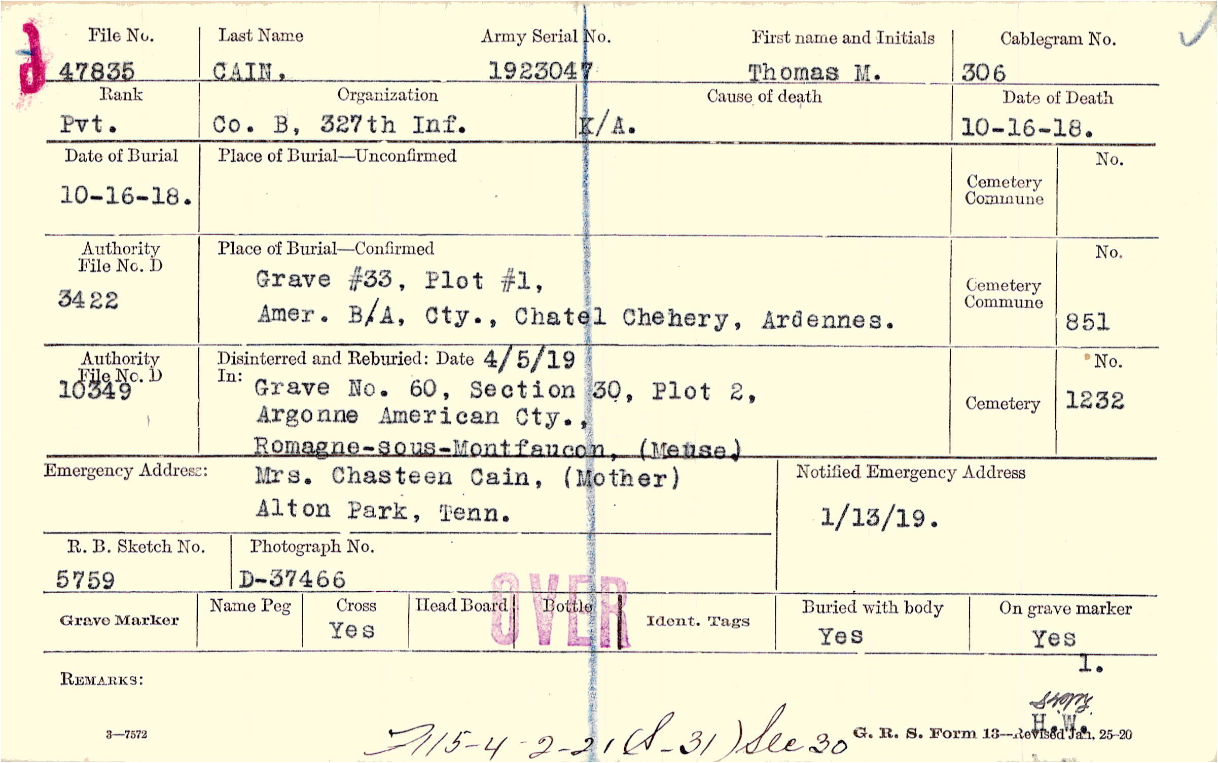 Grave #33, Plot #1, Amer. B/A Cty., Chatel Chehery, Ardennes.