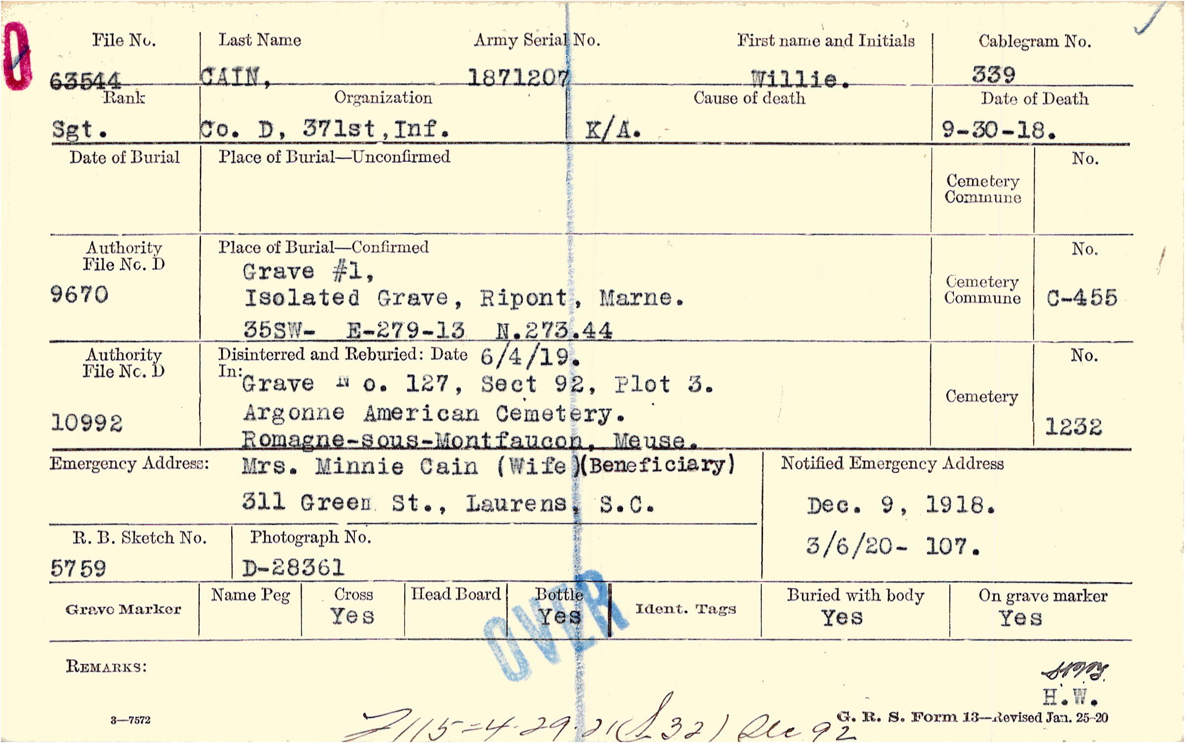 Mrs. Minnie Cain (Wife) (Beneficiary), 311 Green St., Laurens, S.C., (Beneficiary)