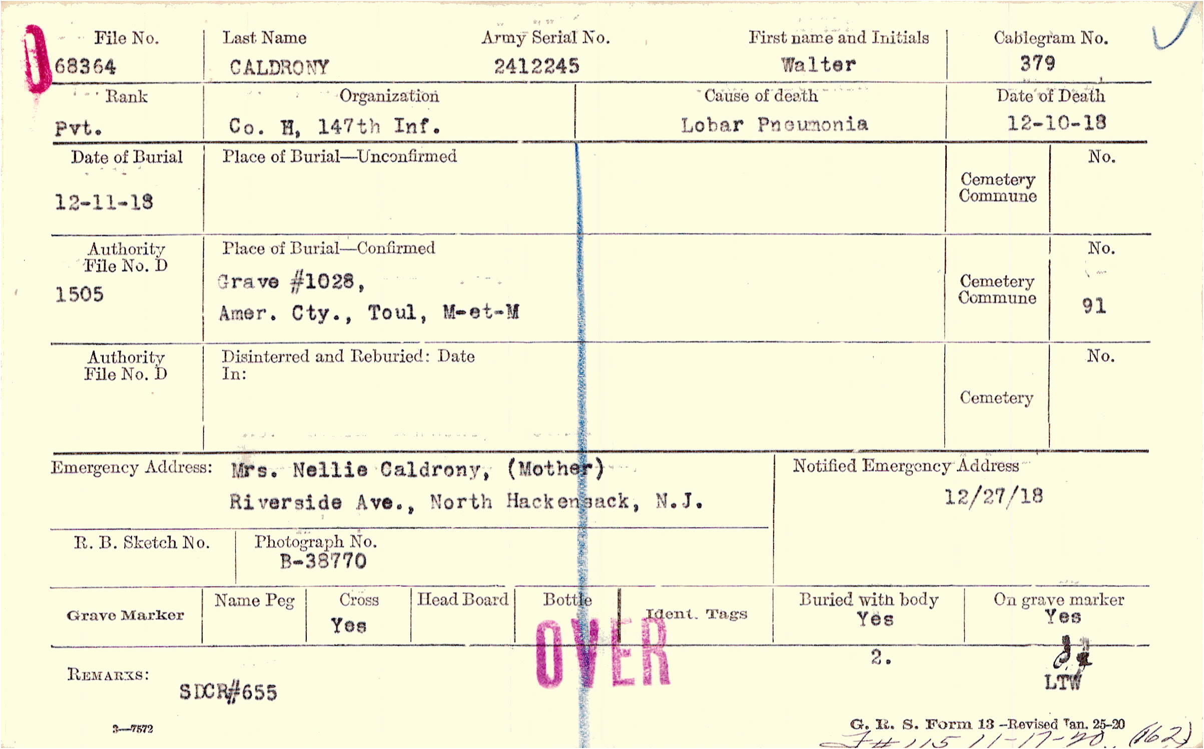Mrs. Nellie Caldrony, (Mother), Riverside Ave., North Hackensack, N.J.