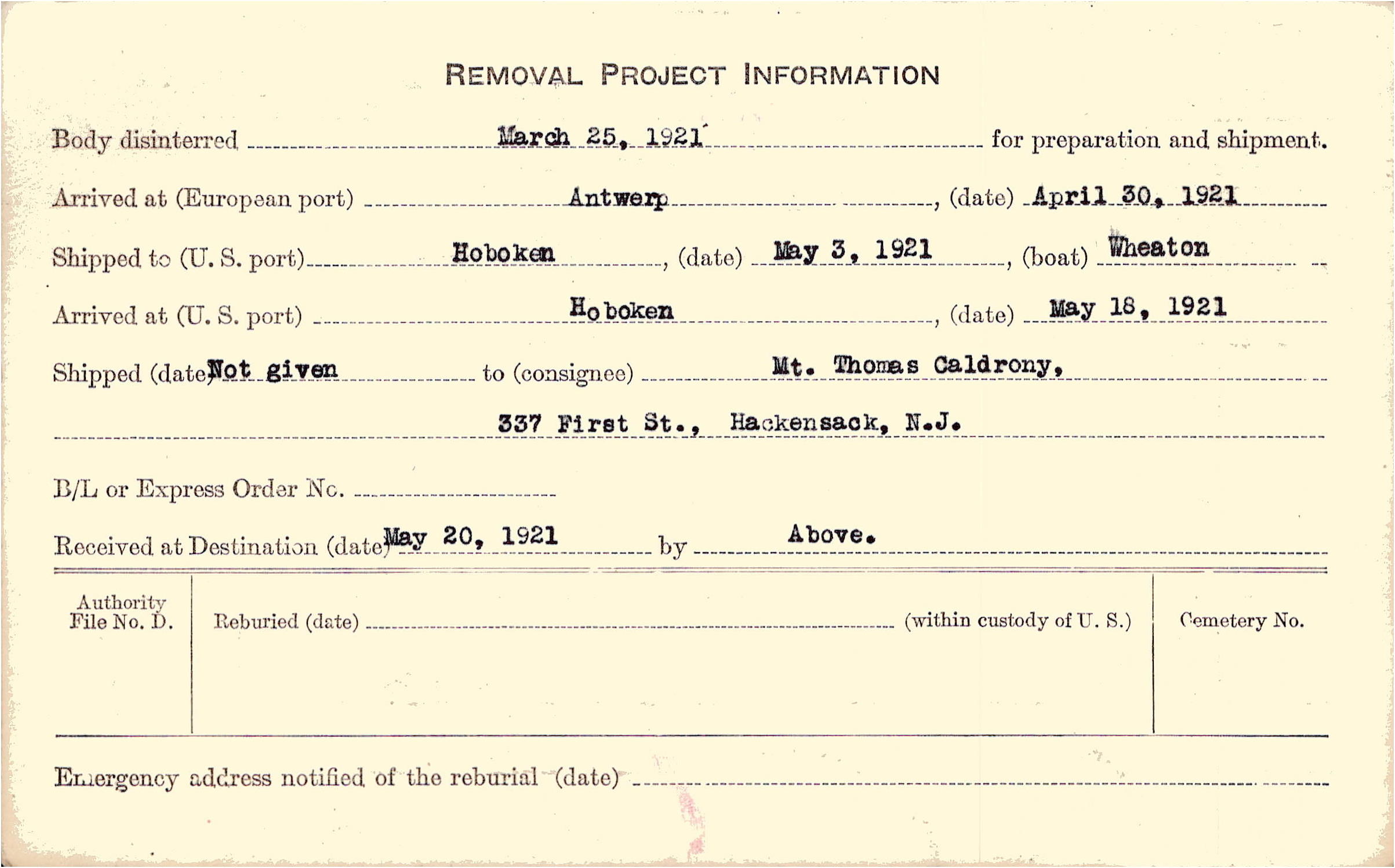 to Mt. Thomas Caldrony, 337 First St., Hackensack, N.J.