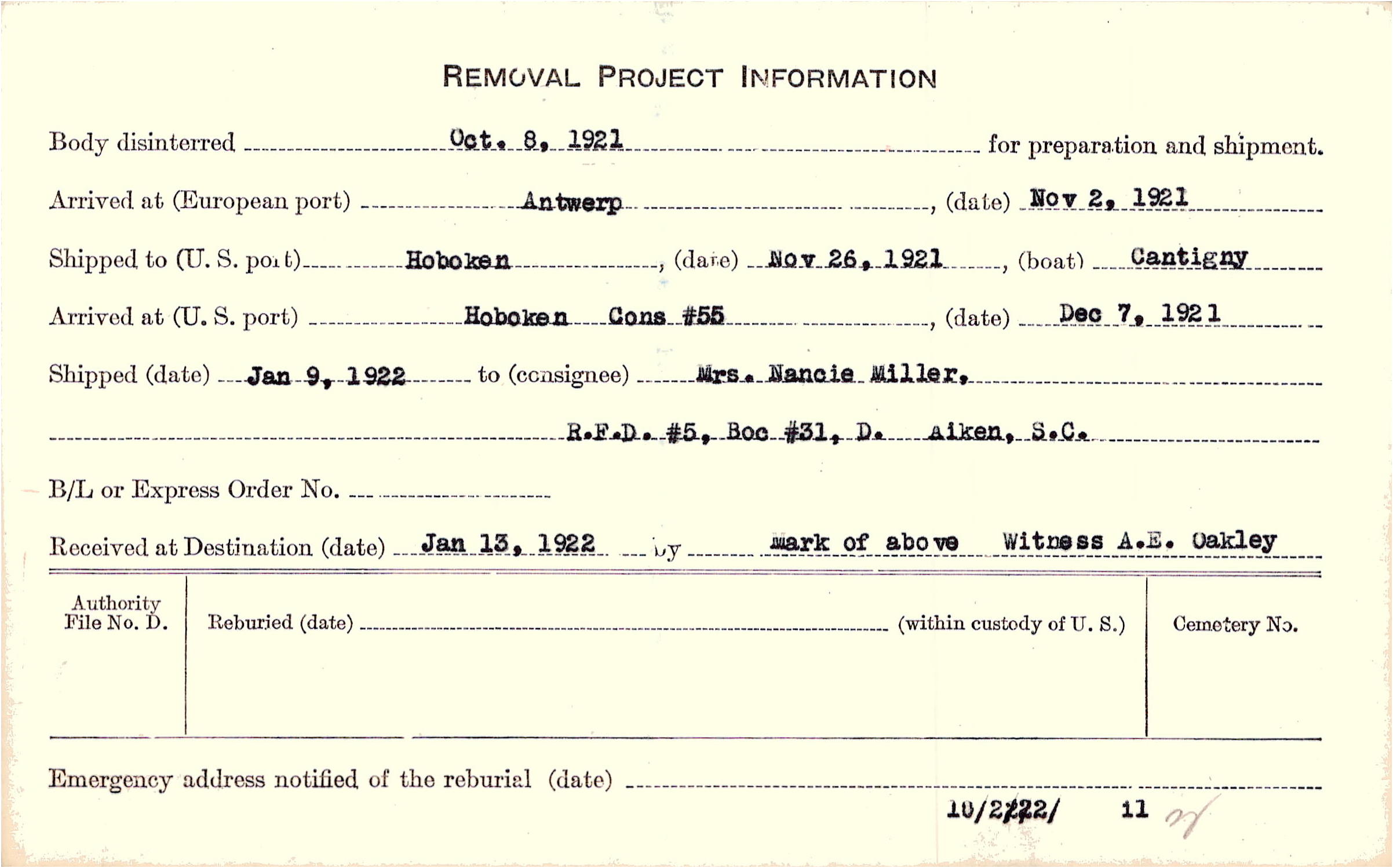 Body disinterred 10/8/1921 for preparation and shipment.