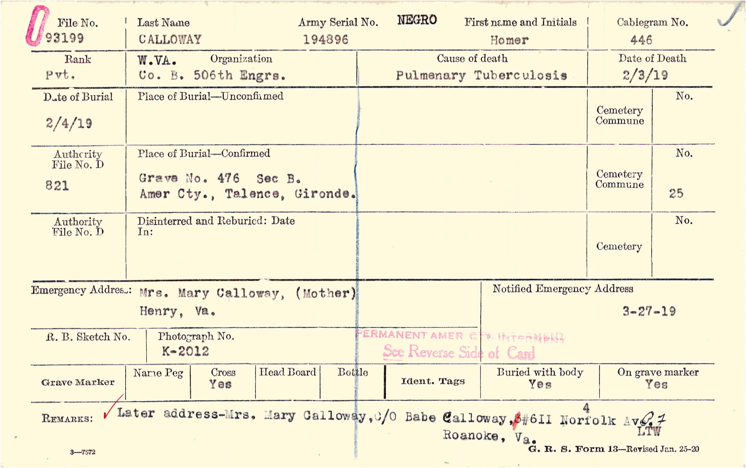 Grave 476, Sec. B., Amer. Cty.,Talence, Gironde