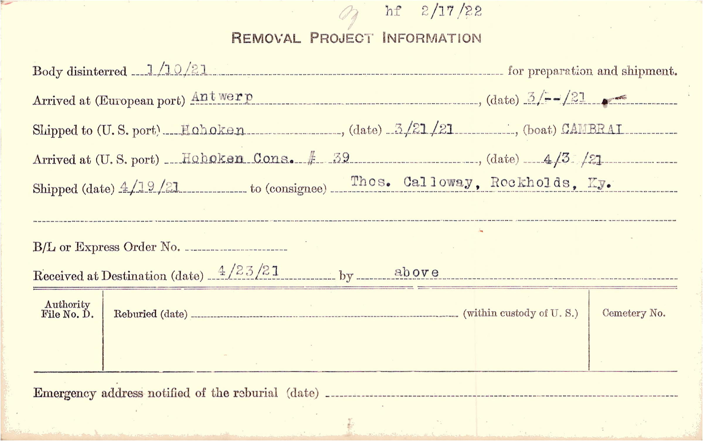 Body disinterred 1/10/1921 for preparation and shipment.