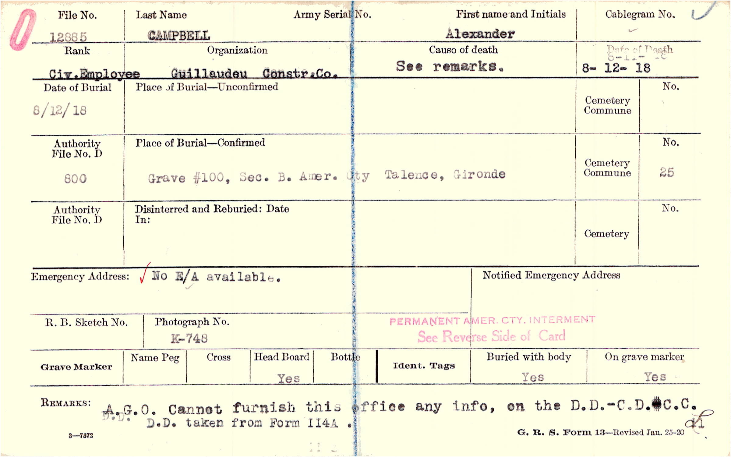 Grave #100, Sec. B, Amer. Cty., Talence, Gironde