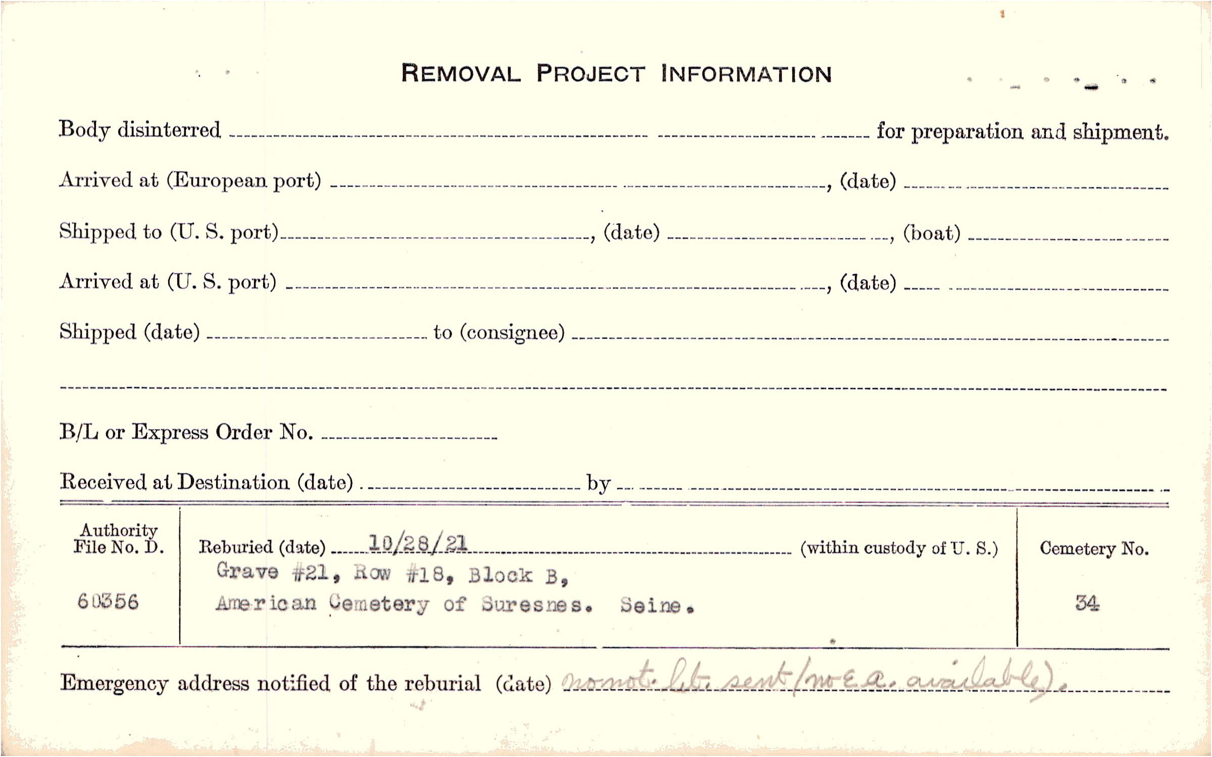 | Permanent Burial in Foreign Cemetery |