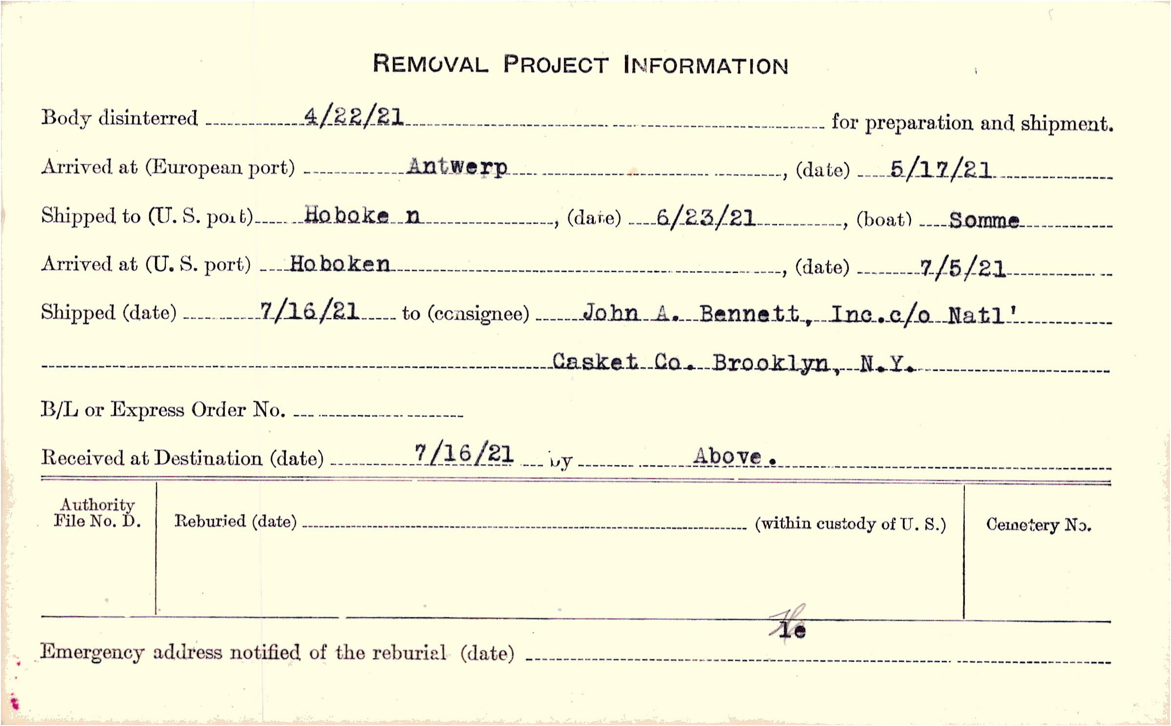 to John A. Bennett, Inc., c/o Natl' Casket Co., Brooklyn, N.Y.