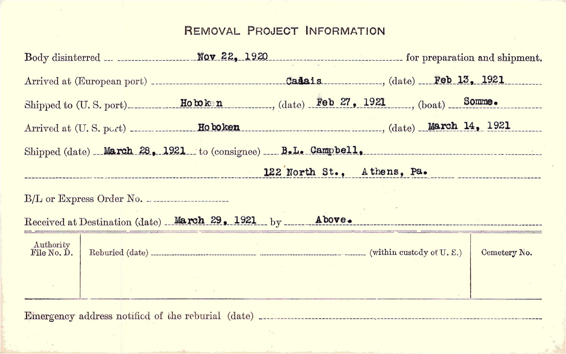 Body disinterred 11/22/1920 for preparation and shipment.